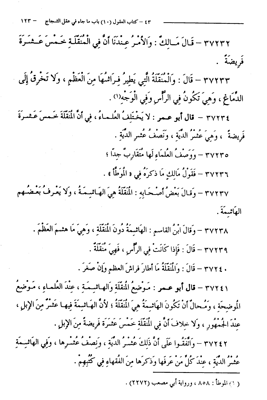 37232 - قَالَ مَالِكٌ: وَالْأَمْرُ عِنْدَنَا أَنَّ فِي الْمُنَقِّلَةِ خَمْسَ عَشْرَةَ فَرِيضَةً.