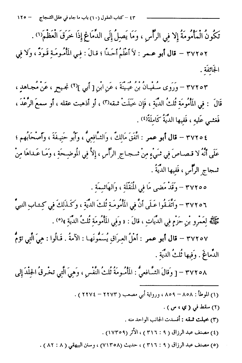 37256 - وَاتَّفَقُوا عَلَى أَنْ فِي الْمَأْمُومَةِ ثُلُثَ الدِّيَةِ، وَكَذَلِكَ فِي كِتَابِ النَّبِيِّ - صَلَّى اللَّهُ عَلَيْهِ وَسَلَّمَ - لِعَمْرِو بْنِ حَزْمٍ فِي الدِّيَاتِ، قَالَ: "وَفِي الْمَأْمُومَةِ ثُلُثُ الدِّيَةِ ".