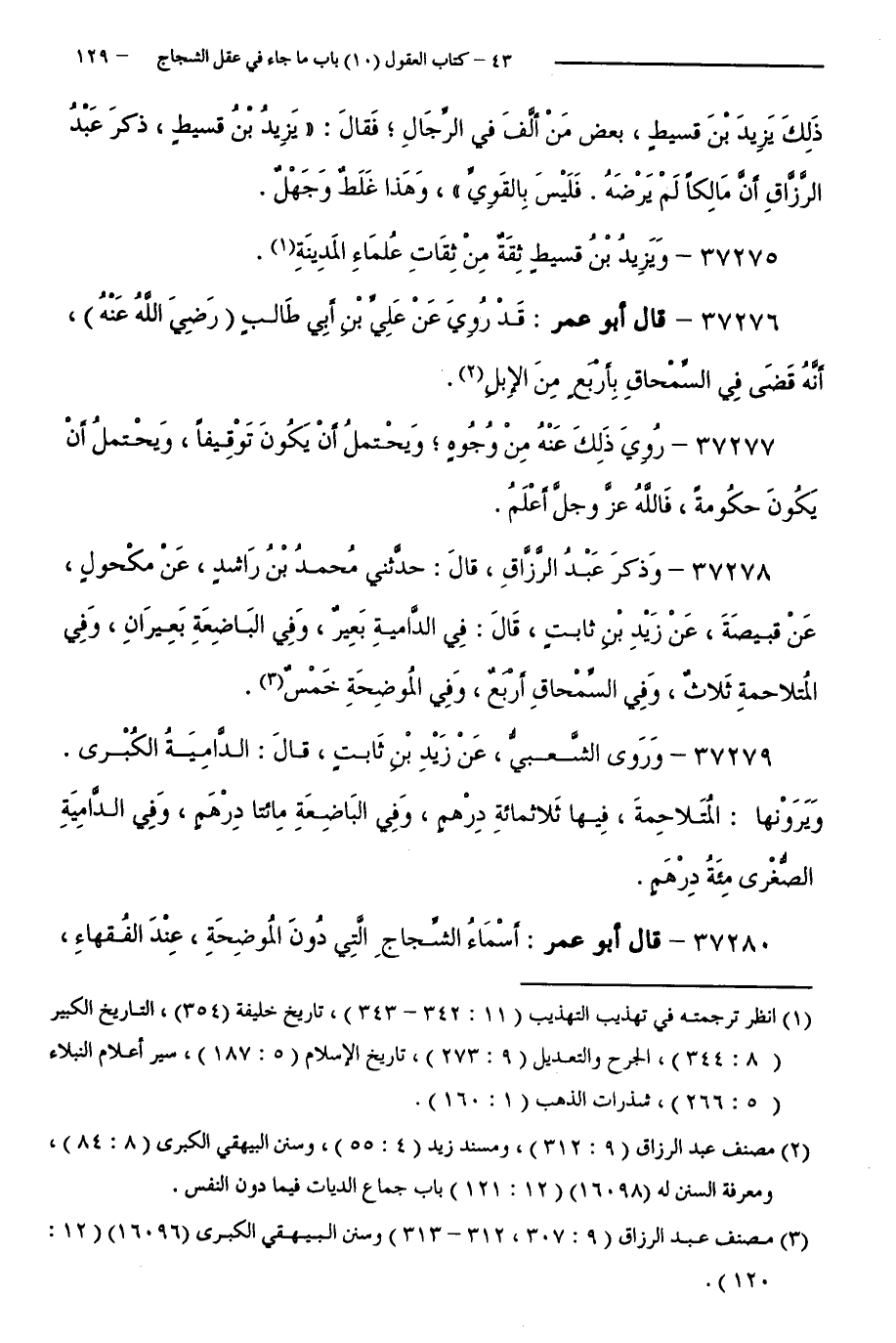 37278 - وَذَكَرَ عَبْدُ الرَّزَّاقِ، قَالَ: حَدَّثَنِي مُحَمَّدُ بْنُ رَاشِدٍ، عَنْ مَكْحُولٍ، عَنْ قَبِيصَةَ، عَنْ زَيْدِ بْنِ ثَابِتٍ، قَالَ: فِي الدَّامِيَةِ بَعِيرٌ، وَفِي الْبَاضِعَةِ بَعِيرَانِ، وَفِي الْمُتَلَاحِمَةِ ثَلَاثٌ، وَفِي السِّمْحَاقِ أَرْبَعٌ، وَفِي الْمُوضِحَةِ خَمْسٌ.