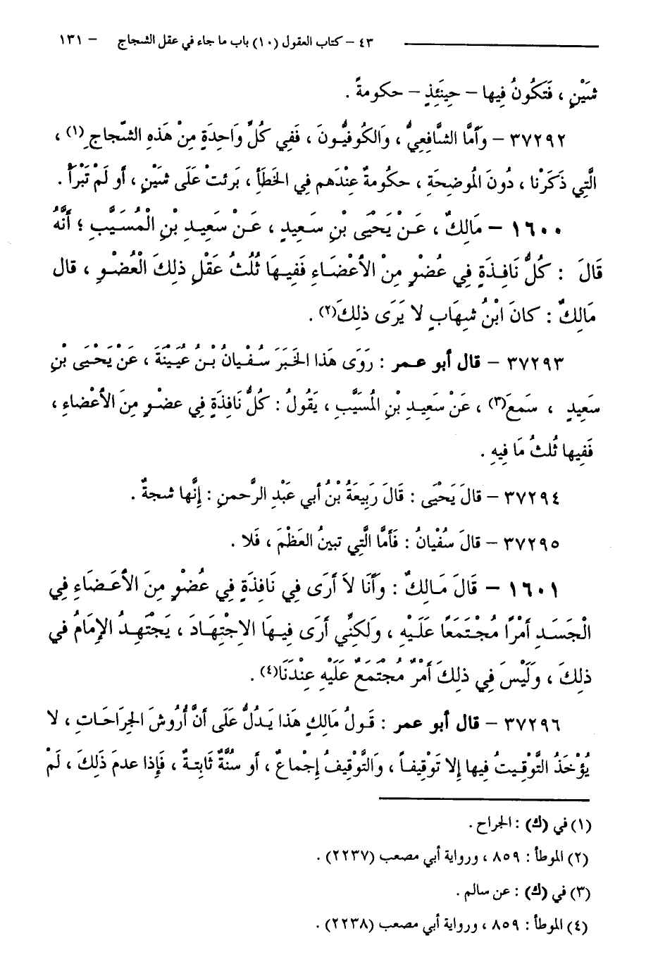 1600 - مَالِكٌ، عَنْ يَحْيَى بْنِ سَعِيدٍ، عَنْ سَعِيدِ بْنِ الْمُسَيَّبِ، أَنَّهُ قَالَ: كُلُّ نَافِذَةٍ فِي عُضْوٍ مِنَ الْأَعْضَاءِ فَفِيهَا ثُلُثُ عَقْلِ ذَلِكَ الْعُضْوِ، قَالَ مَالِكٌ: كَانَ ابْنُ شِهَابٍ لَا يَرَى ذَلِكَ.