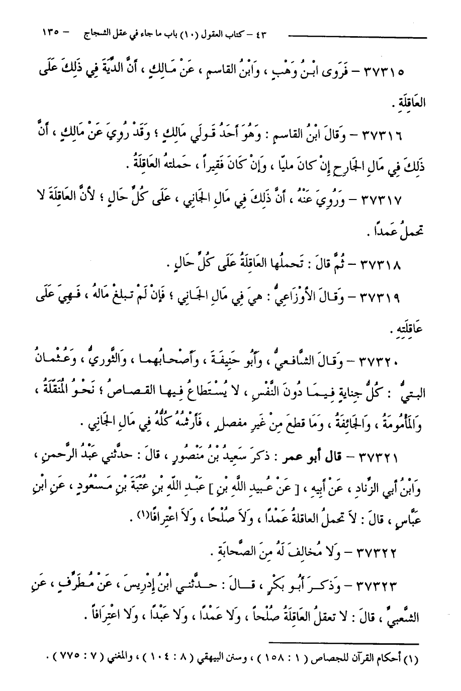 37315 - فَرَوَى ابْنُ وَهْبٍ، وَابْنُ الْقَاسِمِ، عَنْ مَالِكٍ، أَنَّ الدِّيَةَ فِي ذَلِكَ عَلَى الْعَاقِلَةِ.
