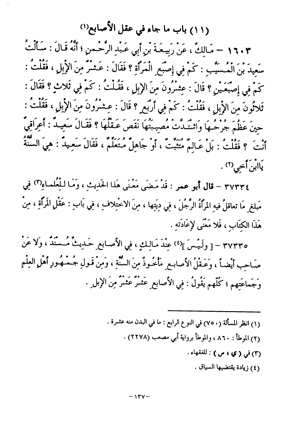 1603 - مَالِكٌ، عَنْ رَبِيعَةَ بْنِ أَبِي عَبْدِ الرَّحْمَنِ، أَنَّهُ قَالَ: سَأَلْتُ سَعِيدَ بْنَ الْمُسَيَّبِ: كَمْ فِي إِصْبَعِ الْمَرْأَةِ ؟ فَقَالَ: عَشْرٌ مِنَ الْإِبِلِ، فَقُلْتُ: كَمْ فِي إِصْبَعَيْنِ ؟ قَالَ: عِشْرُونَ مِنَ الْإِبِلِ، فَقُلْتُ: كَمْ فِي ثَلَاثٍ ؟ فَقَالَ: ثَلَاثُونَ مِنَ الْإِبِلِ، فَقُلْتُ: كَمْ فِي أَرْبَعٍ ؟ قَالَ: عِشْرُونَ مِنَ الْإِبِلِ، فَقُلْتُ: حِينَ عَظُمَ جُرْحُهَا وَاشْتَدَّتْ مُصِيبَتُهَا نَقَصَ عَقْلُهَا ؟ فَقَالَ سَعِيدٌ: أَعِرَاقِيُّ أَنْتَ ؟ فَقُلْتُ: بَلْ عَالِمٌ مُتَثَبِّتٌ، أَوْ جَاهِلٌ مُتَعَلِّمٌ، فَقَالَ سَعِيدٌ: هِيَ السُّنَّةُ يَا ابْنَ أَخِي.