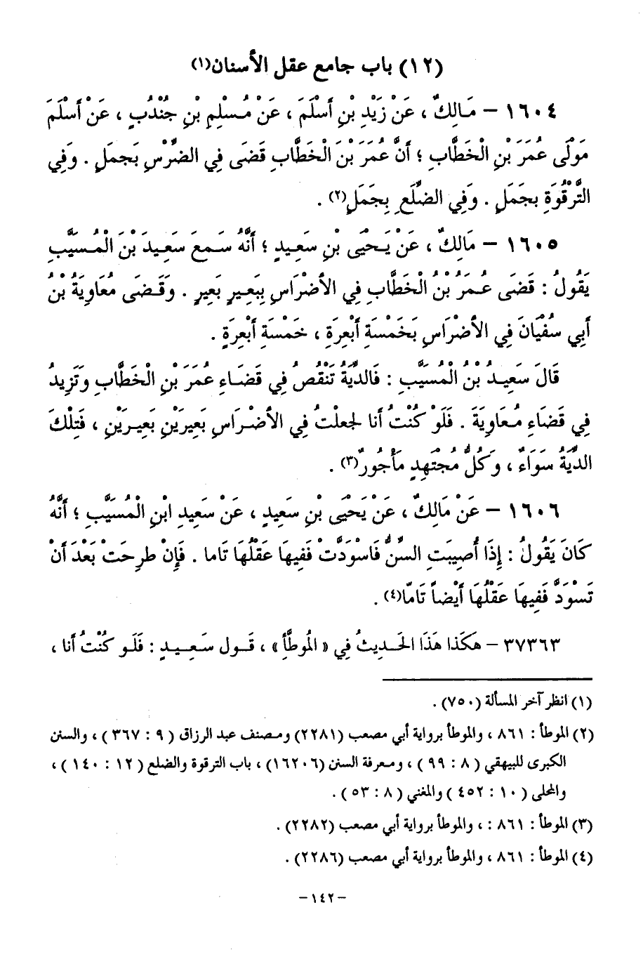 1605 - مَالِكٌ، عَنْ يَحْيَى بْنِ سَعِيدٍ، أَنَّهُ سَمِعَ سَعِيدَ بْنَ الْمُسَيَّبِ يَقُولُ: قَضَى عُمَرُ بْنُ الْخَطَّابِ فِي الْأَضْرَاسِ بِبَعِيرٍ بِعِيرٍ. وَقَضَى مُعَاوِيَةُ بْنُ أَبِي سُفْيَانَ فِي الْأَضْرَاسِ بِخَمْسَةِ أَبْعِرَةٍ، خَمْسَةِ أَبْعِرَةٍ.