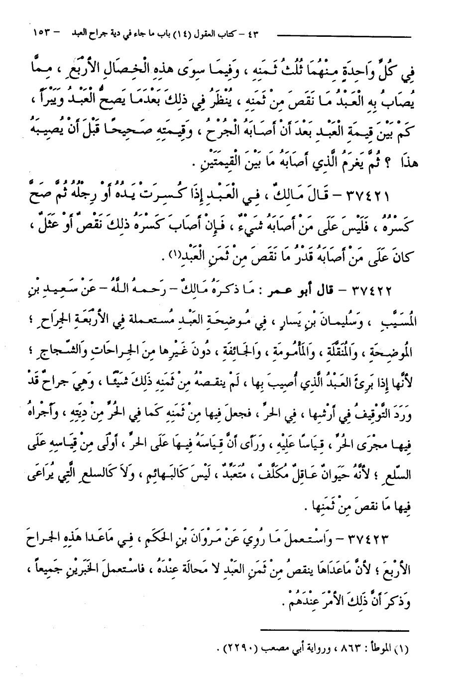 37421 - قَالَ مَالِكٌ: فِي الْعَبْدِ إِذَا كُسِرَتْ يَدُهُ أَوْ رِجْلُهُ ثُمَّ صَحَّ كَسْرُهُ، فَلَيْسَ عَلَى مَنْ أَصَابَهُ شَيْءٌ، فَإِنْ أَصَابَ كَسْرَهُ ذَلِكَ نَقْصٌ أَوْ عَثَلٌ، كَانَ عَلَى مَنْ أَصَابَهُ قَدْرُ مَا نَقَصَ مِنْ ثَمَنِ الْعَبْدِ.
