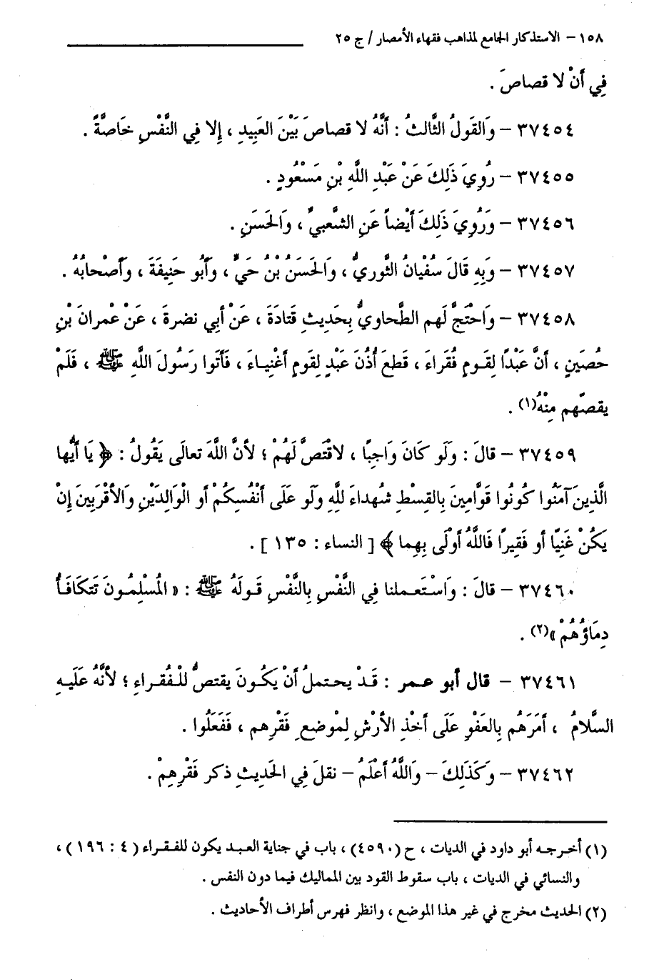 37460 - قَالَ: وَاسْتَعْمَلَنَا فِي النَّفْسِ بِالنَّفْسِ قَوْلَهُ - صَلَّى اللَّهُ عَلَيْهِ وَسَلَّمَ -: "الْمُسْلِمُونَ تَتَكَافَأُ دِمَاؤُهُمْ ".