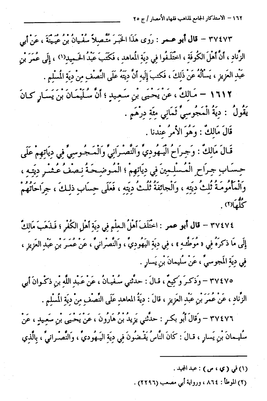 37473 - قَالَ أَبُو عُمَرَ: رَوَى هَذَا الْخَبَرَ مُتَصِّلًا سُفْيَانُ بْنُ عُيَيْنَةَ، عَنْ أَبِي الزِّنَادِ، أَنَّ أَهْلَ الْكُوفَةِ، اخْتَلَفُوا فِي دِيَةِ الْمُعَاهَدِ، فَكَتَبَ عَبْدُ الْحَمِيدِ، إِلَى عُمَرَ بْنِ عَبْدِ الْعَزِيزِ، يَسْأَلُهُ عَنْ ذَلِكَ، فَكَتَبَ إِلَيْهِ أَنَّ دِيَتَهُ عَلَى النِّصْفِ مِنْ دِيَةِ الْمُسْلِمِ.