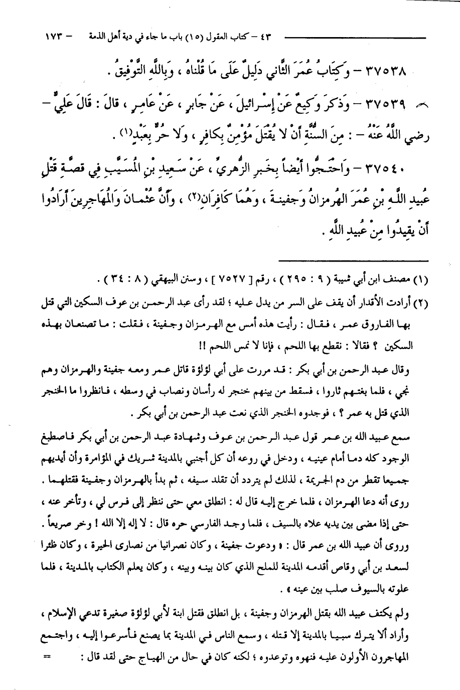 37540 - وَاحْتَجُّوا أَيْضًا بِخَبَرِ الزُّهْرِيِّ، عَنْ سَعِيدِ بْنِ الْمُسَيَّبِ فِي قِصَّةِ قَتْلِ عُبَيْدِ اللَّهِ بْنِ عُمَرَ الْهُرْمُزَانِ وَجُفَيْنَةَ، وَهُمَا كَافِرَانِ، وَأَنَّ عُثْمَانَ وَالْمُهَاجِرِينَ أَرَادُوا أَنْ يُقِيدُوا مِنْ عُبَيْدِ اللَّهِ.