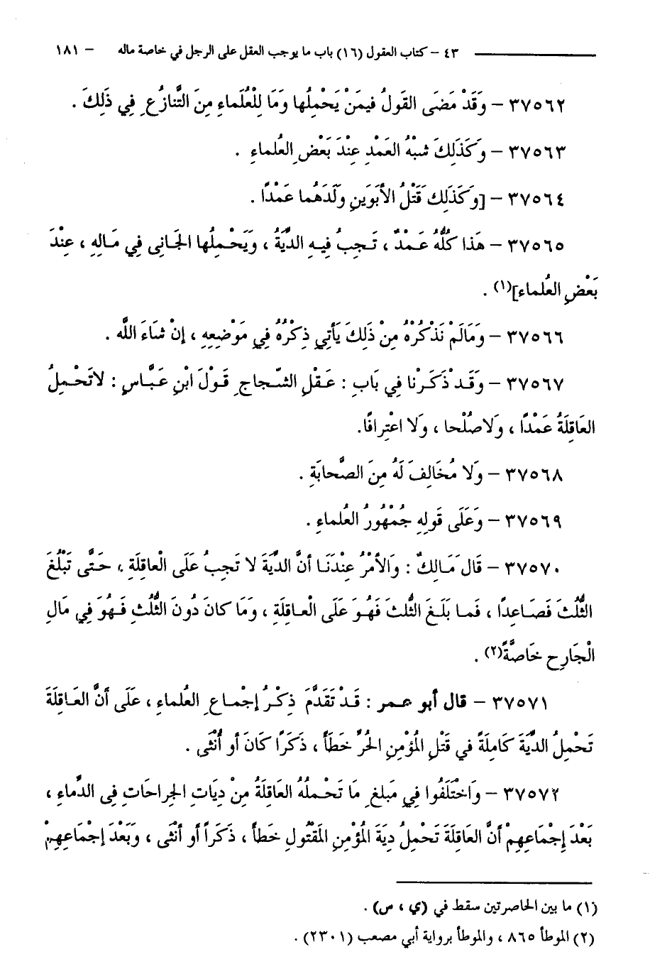37570 - قَالَ مَالِكٌ: وَالْأَمْرُ عِنْدَنَا أَنَّ الدِّيَةَ لَا تَجِبُ عَلَى الْعَاقِلَةِ، حَتَّى تَبْلُغَ الثُّلُثَ فَصَاعِدًا، فَمَا بَلَغَ الثُّلُثَ فَهُوَ عَلَى الْعَاقِلَةِ، وَمَا كَانَ دُونَ الثُّلُثِ فَهُوَ فِي مَالِ الْجَارِحِ خَاصَّةً.