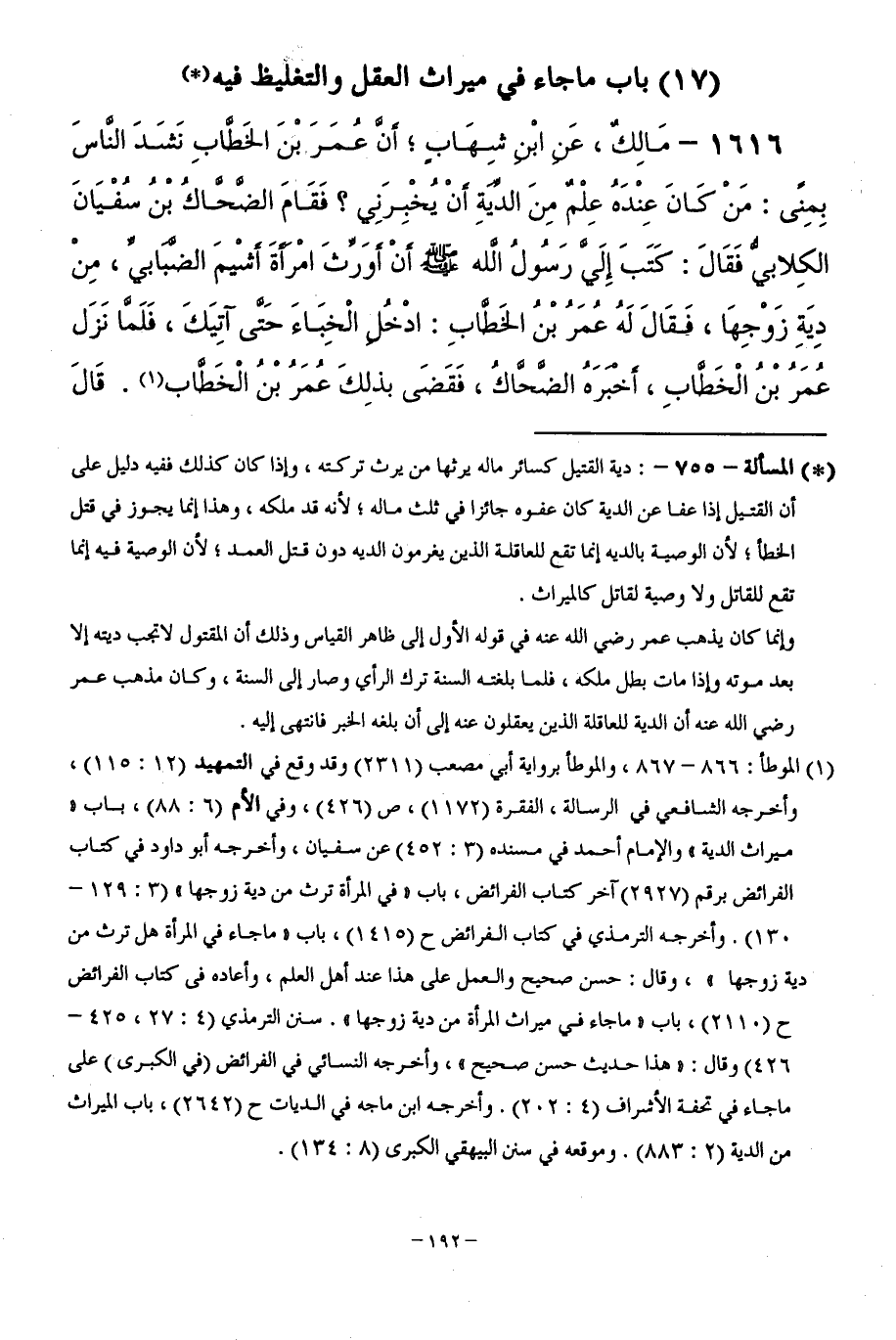 1616 - مَالِكٌ، عَنِ ابْنِ شِهَابٍ،أَنَّ عُمَرَ بْنِ الْخَطَّابِ نَشَدَ النَّاسَ بِمِنًى: مَنْ كَانَ عِنْدَهُ عِلْمٌ مِنَ الدِّيَةِ أَنْ يُخْبِرَنِي ؟ فَقَامَ الضَّحَّاكُ بْنُ سُفْيَانَ الْكِلَابِيُّ فَقَالَ: كَتَبَ إِلَيَّ رَسُولُ اللَّهِ - صَلَّى اللَّهُ عَلَيْهِ وَسَلَّمَ - أَنْ أُوَرِّثَ امْرَأَةَ أَشْيَمَ الضَّبَابِيِّ، مِنْ دِيَةِ زَوْجِهَا، فَقَالَ لَهُ عُمَرُ بْنُ الْخَطَّابِ: ادْخُلِ الْخِبَاءَ حَتَّى آتِيَكَ، فَلَمَّا نَزَلَ عُمَرُ بْنُ الْخَطَّابِ، أَخْبَرَهُ الضَّحَّاكُ، فَقَضَى عُمَرُ بْنُ الْخَطَّابِ. قَالَ