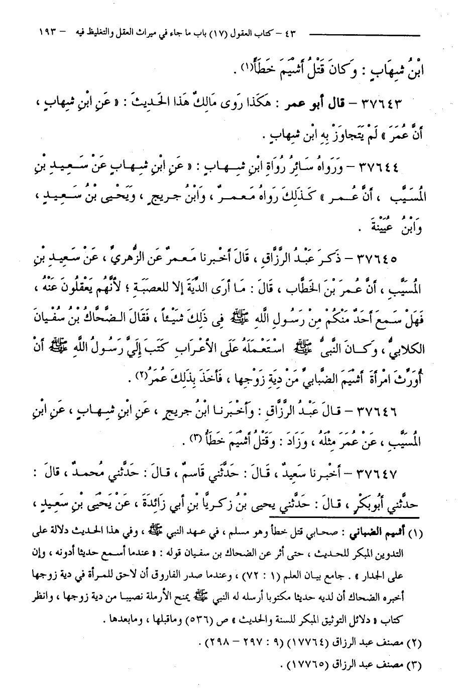 37645 - ذَكَرَ عَبْدُ الرَّزَّاقِ، قَالَ أَخْبَرَنَا مَعْمَرٌ عَنِ الزُّهْرِيِّ، عَنْ سَعِيدِ بْنِ الْمُسَيَّبِ،أَنَّ عُمَرَ بْنَ الْخَطَّابِ، قَالَ مَا أَرَى الدِّيَةَ إِلَّا لِلْعَصَبَةِ، لِأَنَّهُمْ يَعْقِلُونَ عَنْهُ، فَهَلْ سَمِعَ أَحَدٌ مِنْكُمْ مِنْ رَسُولِ - صَلَّى اللَّهُ عَلَيْهِ وَسَلَّمَ - فِي ذَلِكَ شَيْئًا، فَقَالَ الضَّحَّاكُ بْنُ سُفْيَانَ الْكِلَابِيُّ، وَكَانَ النَّبِيُّ - صَلَّى اللَّهُ عَلَيْهِ وَسَلَّمَ - اسْتَعْمَلَهُ عَلَى الْأَعْرَابِ كَتَبَ إِلَيَّ رَسُولُ اللَّهِ - صَلَّى اللَّهُ عَلَيْهِ وَسَلَّمَ - أَنْ أُوَرِّثَ امْرَأَةَ أَشْيَمَ الضَّبَابِيِّ مِنْ دِيَةِ زَوْجِهَا، فَأَخَذَ بِذَلِكَ عُمَرُ.