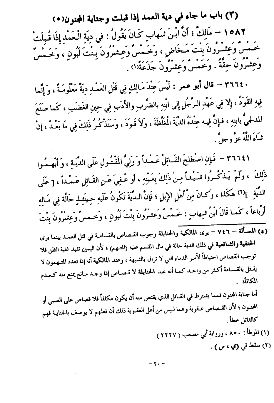1582 - مَالِكٌ، أَنَّ ابْنَ شِهَابٍ كَانَ يَقُولُ: فِي دِيَةِ الْعَمْدِ إِذَا قُبِلَتْ خَمْسٌ وَعِشْرُونَ بِنْتَ مَخَاضٍ، وَخَمْسٌ وَعِشْرُونَ بِنْتَ لَبُونٍ، وَخَمْسٌ وَعِشْرُونَ حِقَّةً، وَخَمْسٌ وَعِشْرُونَ جَذَعَةً.