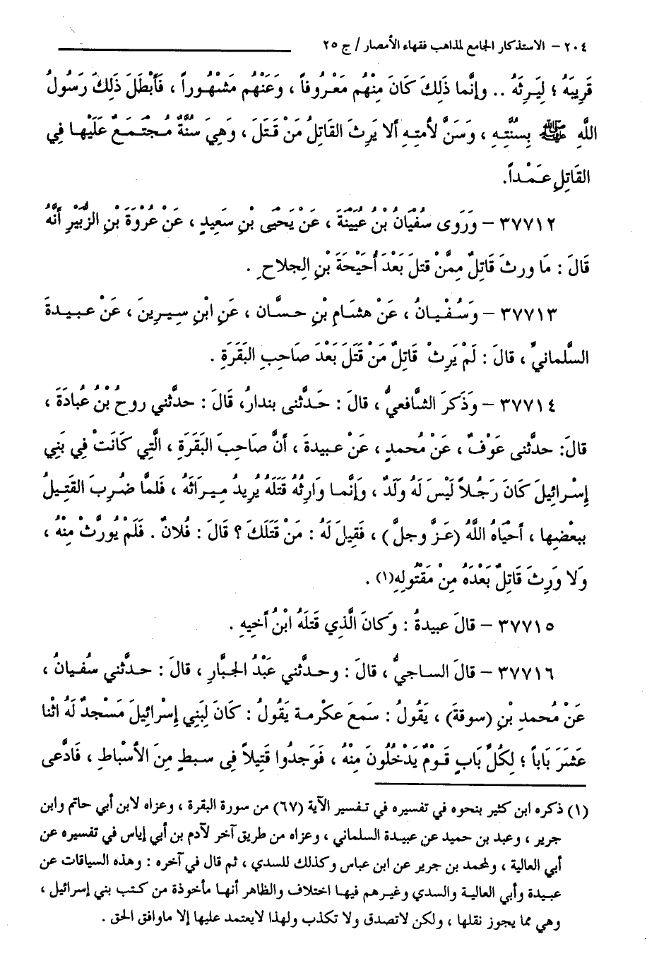 37713 - وَسُفْيَانُ، عَنْ هِشَامِ بْنِ حَسَّانَ، عَنِ ابْنِ سِيرِينَ، عَنْ عَبِيدَةَ السَّلْمَانِيِّ، قَالَ: لَمْ يَرِثْ قَاتِلٌ مَنْ قَتَلَ بَعْدَ صَاحِبِ الْبَقَرَةِ.