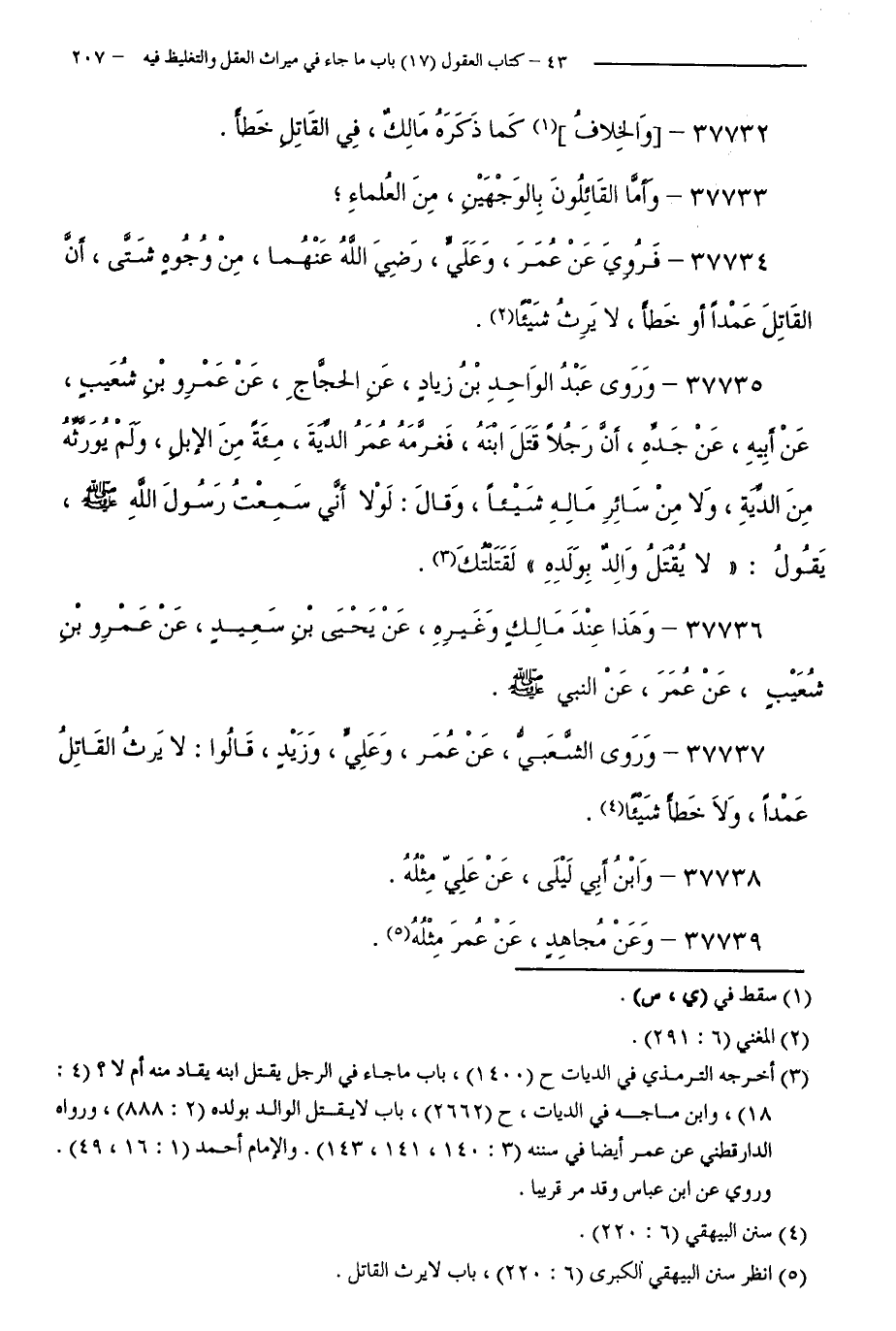 37734 - فَرُوِيَ عَنْ عُمَرَ، وَعَلِيٍّ - رَضِيَ اللَّهُ عَنْهُمَا - مِنْ وُجُوهٍ شَتَّى، أَنَّ الْقَاتِلَ عَمْدًا أَوْ خَطَأً، لَا يَرِثُ شَيْئًا.