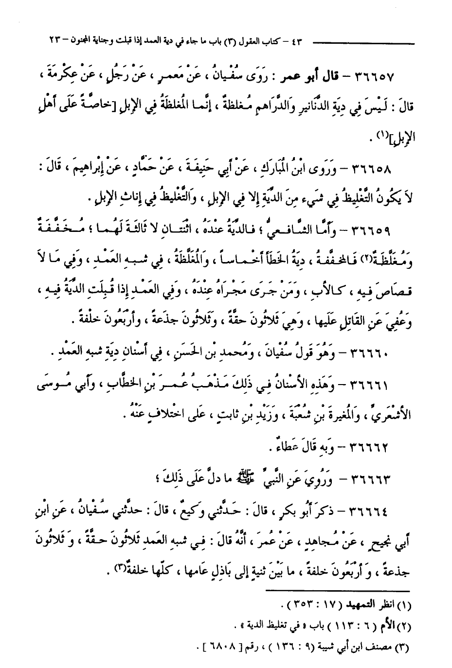 36658 - وَرَوَى ابْنُ الْمُبَارَكِ، عَنْ أَبِي حَنِيفَةَ، عَنْ حَمَّادٍ، عَنْ إِبْرَاهِيمَ، قَالَ لَا يَكُونُ التَّغْلِيظُ فِي شَيْءٍ مِنَ الدِّيَةِ إِلَّا فِي الْإِبِلِ، وَالتَّغْلِيظُ فِي إِنَاثِ الْإِبِلِ.