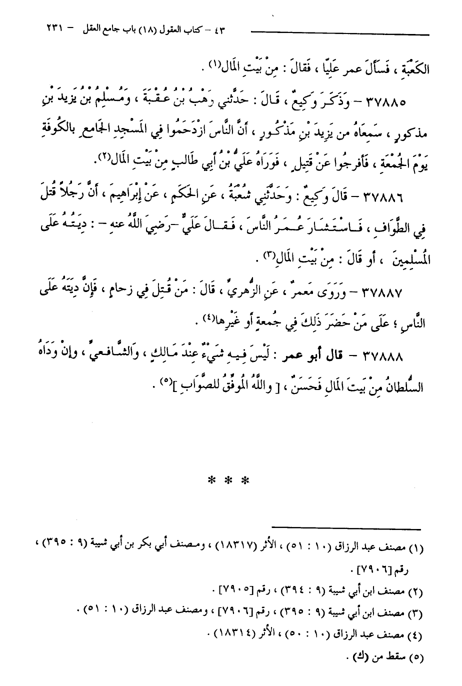 37886 - قَالَ وَكِيعٌ: وَحَدَّثَنِي شُعْبَةُ، عَنِ الْحَكَمِ، عَنْ إِبْرَاهِيمَ، أَنْ رَجُلًا قُتِلَ فِي الطَّوَافِ، فَاسْتَشَارَ عُمَرُ النَّاسَ، فَقَالَ عَلِيٌّ - رَضِيَ اللَّهُ عَنْهُ -: دِيَتُهُ عَلَى الْمُسْلِمِينَ، أَوْ قَالَ: مِنْ بَيْتِ الْمَالِ.