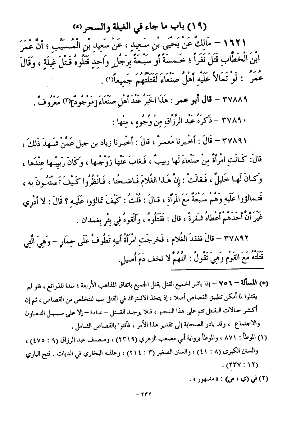 1621 - مَالِكٌ عَنْ يَحْيَى بْنِ سَعِيدٍ، عَنْ سَعِيدِ بْنِ الْمُسَيَّبِ، أَنَّ عُمَرَ بْنَ الْخَطَّابِ قَتَلَ نَفَرًا، خَمْسَةً أَوْ سَبْعَةً بِرَجُلٍ وَاحِدٍ قَتَلُوهُ قَتْلَ غِيلَةٍ، وَقَالَ عُمَرُ: لَوْ تَمَالَأَ عَلَيْهِ أَهْلُ صَنْعَاءَ لَقَتَلْتُهُمْ جَمِيعًا.