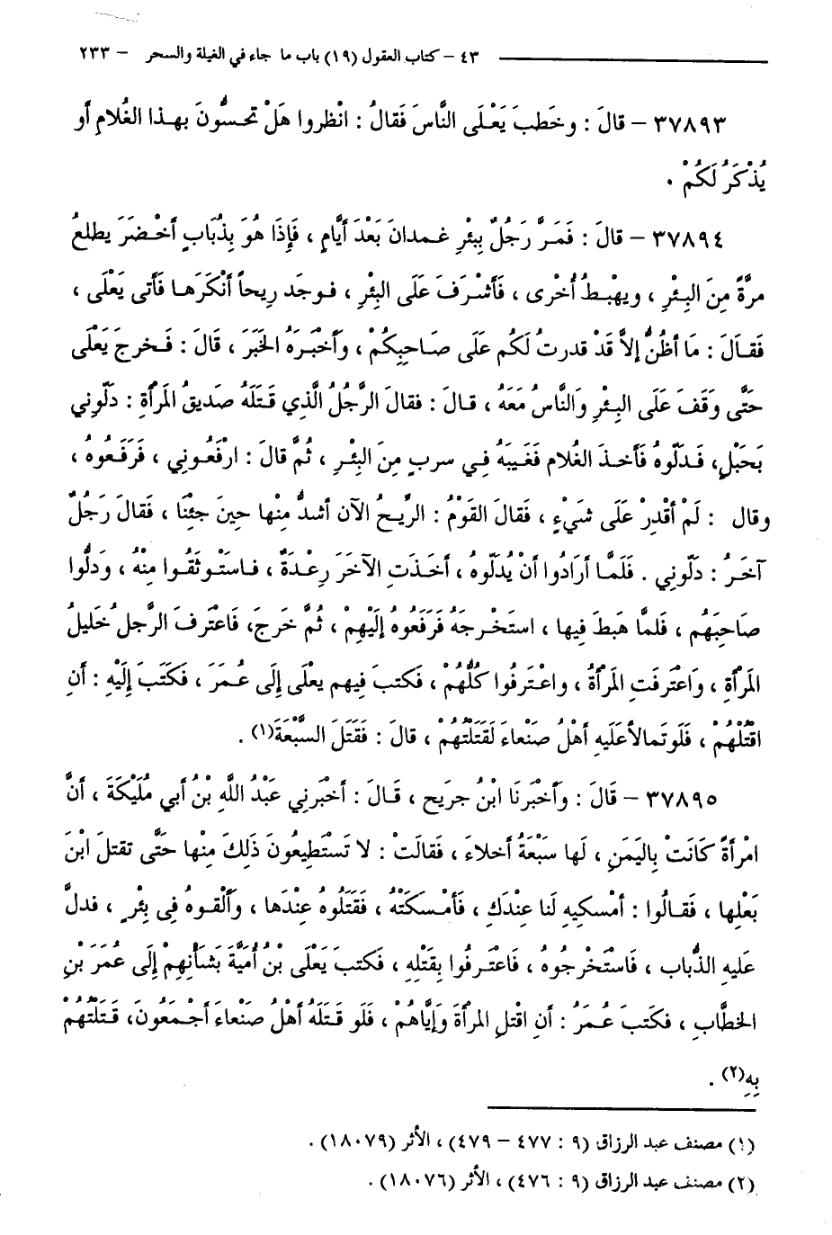 37894 - قَالَ: فَمَرَّ رَجُلٌ بِبِئْر غُمْدَانَ بَعْدَ أَيَّامٍ، فَإِذَا هُوَ بِذُبَابٍ أَخْضَرَ يَطْلُعُ مَرَّةً مِنَ الْبِئْرِ، وَيَهْبِطُ أُخْرَى، فَأَشْرَفَ عَلَى الْبِئْرِ، فَوَجْدَ رِيحًا أَنْكَرَهَا فَأَتَى يَعْلَى، فَقَالَ: مَا أَظُنُّ إِلَّا قَدْ قَدَرْتُ لَكُمْ عَلَى صَاحِبِكُمْ، وَأَخْبَرَهُ الْخَبَرَ، قَالَ: فَخَرَجَ يَعْلَى حَتَّى وَقَفَ عَلَى الْبِئْرِ وَالنَّاسُ مَعَهُ، قَالَ: فَقَالَ الرَّجُلُ الَّذِي قَتَلَهُ صَدِيقُ الْمَرْأَةِ: دَلُّونِي بِحَبْلٍ، فَدَلُّوهُ فَأَخَذَ الْغُلَامَ فَغَيَّبَهُ فِي سِرْبٍ مِنَ الْبِئْرِ، ثُمَّ قَالَ: ارْفَعُونِي، فَرَفَعُوهُ، وَقَالَ: لَمْ أَقْدِرْ عَلَى شَيْءٍ، فَقَالَ الْقَوْمُ: الرِّيحُ الْآنَ أَشَدُّ مِنْهَا حِينَ جِئْنَا، فَقَالَ رَجُلٌ آخَرُ: دَلُّونِي، فَلَمَّا أَرَادُوا أَنْ يُدَلُّوهُ، أَخَذَتِ الْآخَرَ رِعْدَةٌ، فَاسْتَوْثَقُوا مِنْهُ، وَدَلُّوا صَاحِبَهُمْ، فَلَمَّا هَبَطَ فِيهَا، اسْتَخْرَجَهُ فَرَفَعُوهُ إِلَيْهِمْ، ثُمَّ خَرَجَ، فَاعْتَرَفَ الرَّجُلُ خَلِيلُ الْمَرْأَةِ، وَاعْتَرَفَتِ الْمَرْأَةُ، وَاعْتَرَفُوا كُلُّهُمْ، فَكَتَبَ فِيهِمْ يَعْلَى إِلَى عُمَرَ، فَكَتَبَ إِلَيْهِ: أَنِ اقْتُلْهُمْ، فَلَوْ تَمَالَأَ عَلَيْهِمْ أَهْلُ صَنْعَاءَ لَقَتَلْتُهُمْ، قَالَ: فَقَتَلَ السَّبْعَةَ.