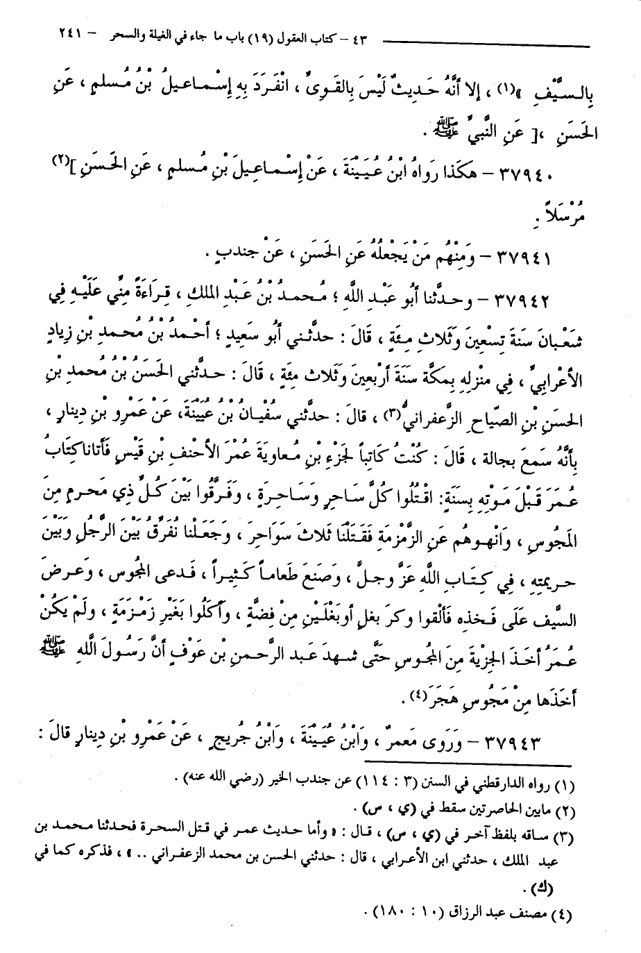37942 - وَحَدَّثَنَا أَبُو عَبْدِ اللَّهِ، مُحَمَّدُ بْنُ عَبْدِ الْمَلِكِ، قِرَاءَةً مِنِّي عَلَيْهِ فِي شَعْبَانَ سَنَةَ تِسْعِينَ وَثَلَاثِمِائَةٍ، قَالَ: حَدَّثَنِي أَبُو سَعِيدٍ، أَحْمَدُ بْنُ مُحَمَّدِ بْنِ زِيَادٍ الْأَعْرَابِيُّ، فِي مَنْزِلِهِ بِمَكَّةَ سَنَةَ أَرْبَعِينَ وَثَلَاثِمِائَةٍ، قَالَ: حَدَّثَنِي الْحَسَنُ بْنُ مُحَمَّدِ بْنِ الْحَسَنِ بْنِ الصَّيَّاحِ الزَّعْفَرَانِيُّ، قَالَ: حَدَّثَنِي سُفْيَانُ بْنُ عُيَيْنَةَ، عَنْ عَمْرِو بْنِ دِينَارٍ، بِأَنَّهُسَمِعَ بَجَالَةَ، قَالَ: كُنْتُ كَاتِبًا لِجَزْءِ بْنِ مُعَاوِيَةَ عُمِّ الْأَحْنَفِ بْنِ قَيْسٍ فَأَتَانَا كِتَابُ عُمَرَ قَبْلَ مَوْتِهِ بِسَنَةٍ: اقْتُلُوا كُلَّ سَاحِرٍ وَسَاحِرَةٍ، وَفَرِّقُوا بَيْن كُلِّ ذِي مَحْرَمٍ مِنَ الْمَجُوسِ، وَانْهَوْهُمْ عَنِ الزَّمْزَمَةِ فَقَتَلْنَا ثَلَاثَةَ سَوَاحِرَ، وَجَعَلَنَا نُفَرِّقُ بَيْنَ الرَّجُلِ وَبَيْنَ حَرِيمَتِهِ، فِي كِتَابِ اللَّهِ - عَزَّ وَجَلَّ - وَصَنَعَ طَعَامًا كَثِيرًا، فَدَعَى الْمَجُوسَ، وَعَرَضَ السَّيْفَ عَلَى فَخِذِهِ فَأَلْقَوْا وِقْرَ بَغْلٍ أَوْ بَغْلَيْنِ مِنْ فِضَّةٍ، وَأَكَلُوا بِغَيْرِ زَمْزَمَةٍ، وَلَمْ يَكُنْ عُمَرُ أَخَذَ الْجِزْيَةَ مِنَ الْمَجُوسِ حَتَّى شَهِدَ عَبْدُ الرَّحْمَنِ بْنُ عَوْفٍ أَنَّ رَسُولَ اللَّهِ - صَلَّى اللَّهُ عَلَيْهِ وَسَلَّمَ - أَخَذَهَا مِنْ مَجُوسِ هَجَرَ.
