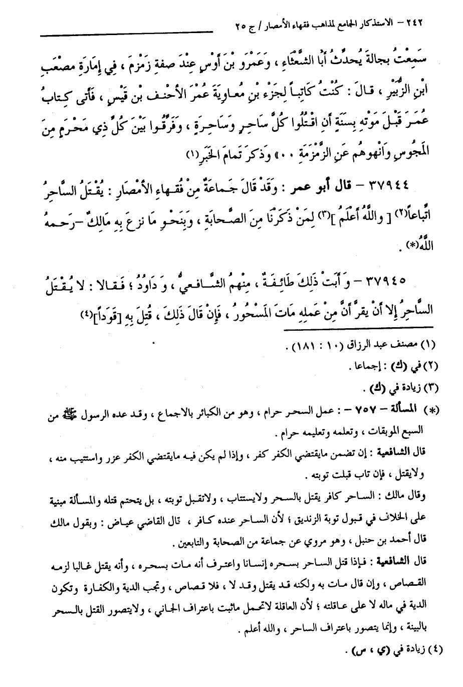 37944 - قَالَ أَبُو عُمَرَ: وَقَدْ قَالَ جَمَاعَةٌ مِنْ فُقَهَاءِ الْأَمْصَارِ: يُقْتَلُ السَّاحِرُ اتِّبَاعًا وَاللَّهُ أَعْلَمُ لِمَنْ ذَكَرْنَا مِنَ الصَّحَابَةِ، وَبِنَحْوِ مَا نَزَعَ بِهِ مَالِكٌ - رَحِمَهُ اللَّهُ.