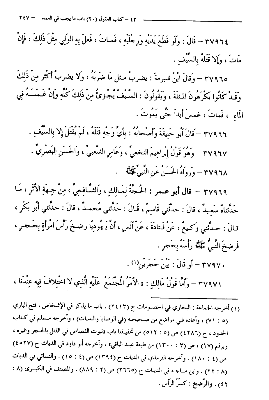 37969 - قَالَ أَبُو عُمَرَ: الْحُجَّةُ لِمَالِكٍ، وَالشَّافِعِيِّ، مِنْ جِهَةِ الْأَثَرِ، مَا حَدَّثَنَاهُ سَعِيدٌ، قَالَ: حَدَّثَنِي قَاسِمٌ، قَالَ: حَدَّثَنِي مُحَمَّدٌ، قَالَ حَدَّثَنِي أَبُو بَكْرٍ، قَالَ: حَدَّثَنِي وَكِيعٌ، عَنْ قَتَادَةَ، عَنْ أَنَسٍ،أَنَّ يَهُودِيًّا رَضَخَ رَأْسَ امْرَأَةٍ بِحَجَرٍ، فَرَضَخَ النَّبِيُّ - صَلَّى اللَّهُ عَلَيْهِ وَسَلَّمَ - رَأْسَهُ بِحَجَرٍ.