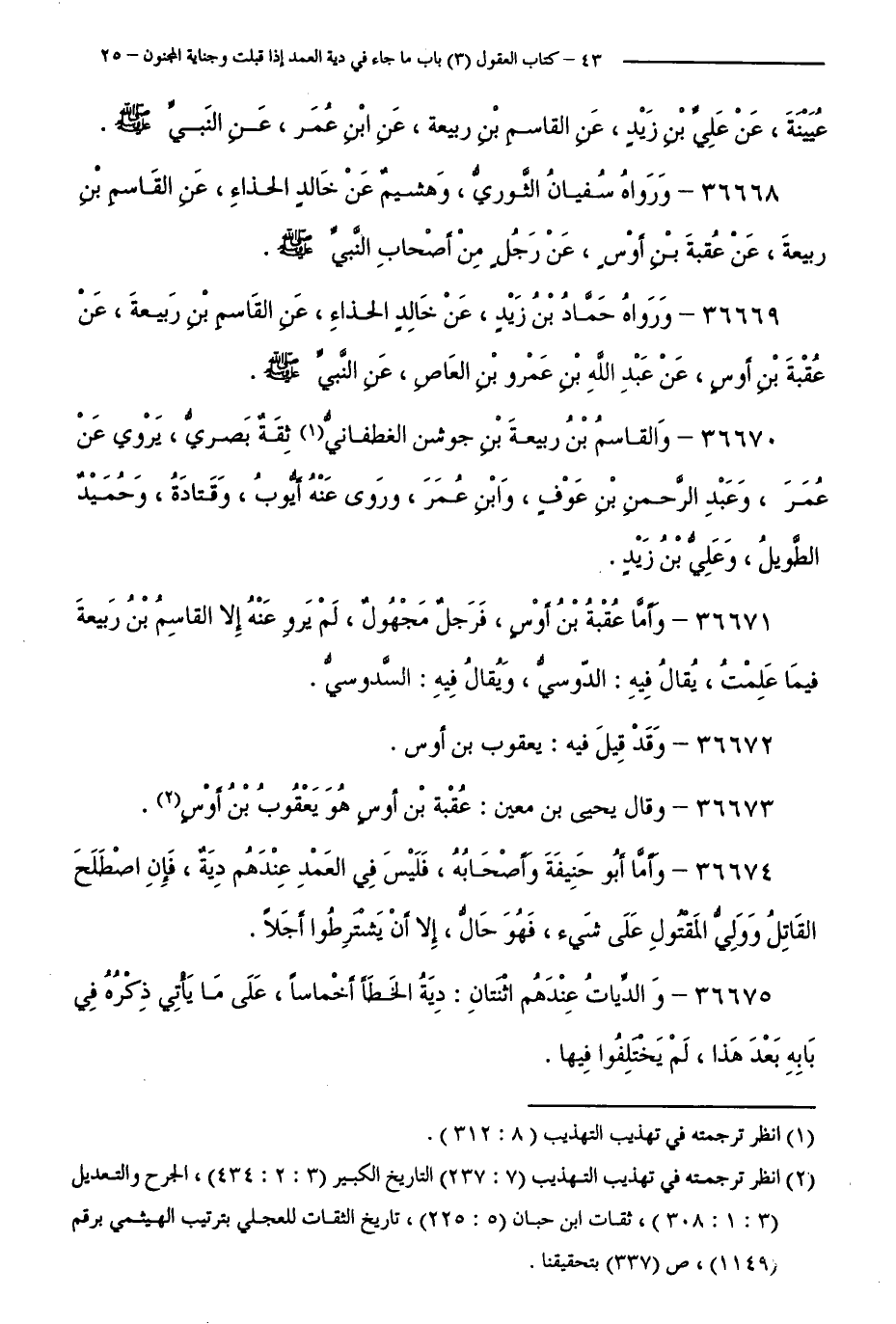 36669 - وَرَوَاهُ حَمَّادُ بْنُ زَيْدٍ، عَنْ خَالِدٍ الْحَذَّاءِ، عَنِ الْقَاسِمِ بْنِ رَبِيعَةَ، عَنْ عُقْبَةَ بْنِ أَوْسٍ، عَنْ عَبْدِ اللَّهِ بْنِ عَمْرِو بْنِ الْعَاصِ، عَنِ النَّبِيِّ - صَلَّى اللَّهُ عَلَيْهِ وَسَلَّمَ.