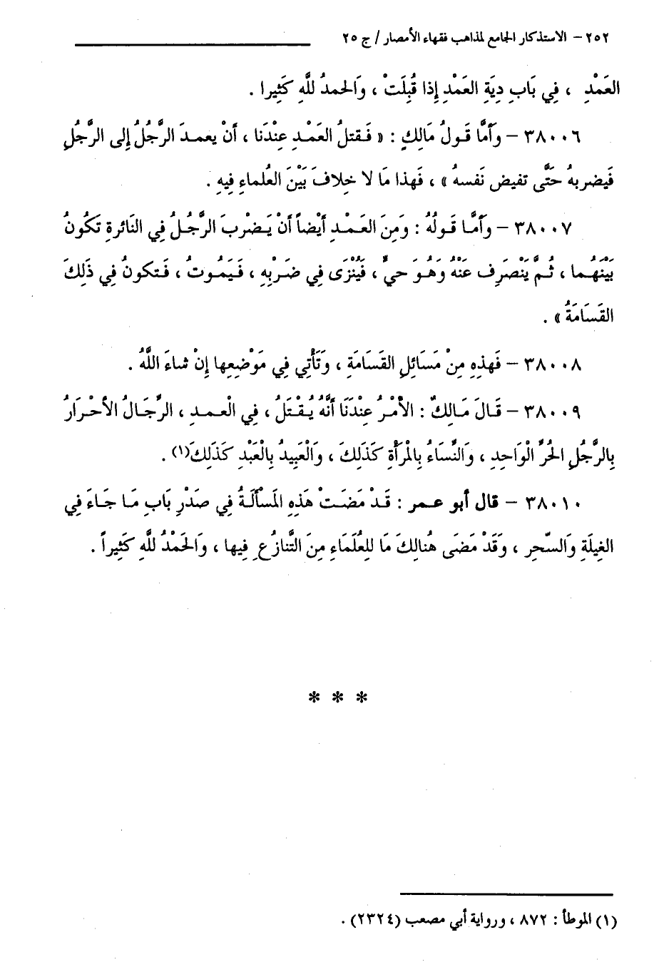38006 - وَأَمَّا قَوْلُ مَالِكٍ: " فَقَتْلُ الْعَمْدِ عِنْدَنَا، أَنْ يَعْمِدَ الرَّجُلُ إِلَى الرَّجُلِ فَيَضْرِبُهُ حَتَّى تَفِيضَ نَفْسُهُ " فَهَذَا مَا لَا خِلَافَ بَيْنِ الْعُلَمَاءِ فِيهِ.