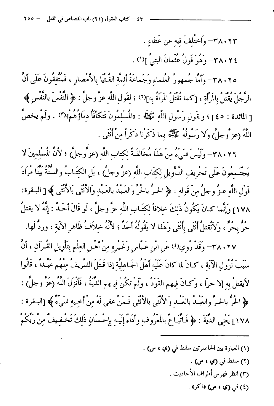 38026 - وَلَيْسَ شَيْءٌ مِنْ هَذَا مُخَالَفَةً لِكِتَابِ اللَّهِ - عَزَّ وَجَلَّ - لِأَنَّ الْمُسْلِمِينَ لَا يَجْتَمِعُونَ عَلَى تَحْرِيفِ التَّأْوِيلِ لِكِتَابِ اللَّهِ - عَزَّ وَجَلَّ - بَلِ الْكِتَابُ وَالسَّنَّةُ بَيَّنَا مُرَادَ قَوْلِ اللَّهِ - عَزَّ وَجَلَّ - مَنْ قَوْلِهِ " (الْحُرُّ بِالْحُرِّ وَالْعَبْدُ بِالْعَبْدِ وَالْأُنْثَى بِالْأُنْثَى ) [ الْبَقَرَةِ: 178 ] وَإِنَّمَا كَانَ يَكُونُ ذَلِكَ خِلَافًا لِكِتَابِ اللَّهِ - عَزَّ وَجَلَّ - لَوْ قَالَ أَحَدٌ: إِنَّهُ لَا يُقْتَلُ حُرٌّ بِحُرٍّ، وَلَا تُقْتَلُ أُنْثَى بِأُنْثَى وَهَذَا لَا يَقُولُهُ أَحَدٌ، لِإِنَّهُ خِلَافُ ظَاهِرِ الْآيَةِ، وَرَدٌّ لَهَا.