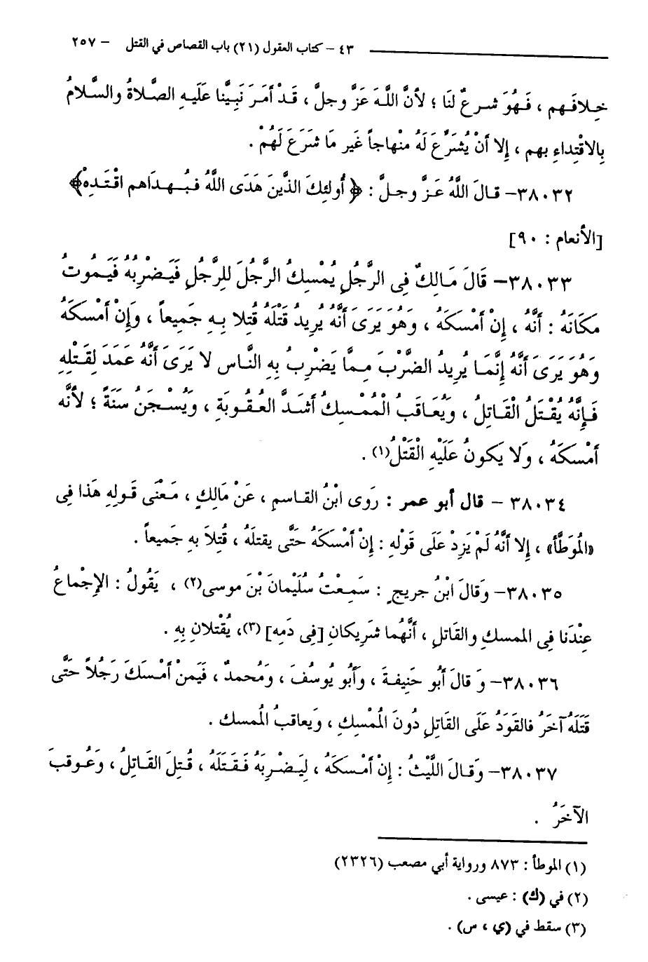 38033 - قَالَ مَالِكٌ فِي الرَّجُلِ يُمْسِكُ الرَّجُلَ لِلرَّجُلِ فَيَضْرِبُهُ فَيَمُوتُ مَكَانَهُ: أَنَّهُ، إِنْ أَمْسَكَهُ، وَهُوَ يَرَى أَنَّهُ يُرِيدُ قَتْلَهُ قُتِلَا بِهِ جَمِيعًا، وَإِنْ أَمْسَكَهُ وَهُوَ يَرَى أَنَّهُ إِنَّمَا يُرِيدُ الضَّرْبَ مِمَّا يَضْرِبُ بِهِ النَّاسَ لَا يَرَى أَنَّهُ عَمَدَ لِقَتْلِهِ فَإِنَّهُ يُقْتَلُ الْقَاتِلُ، وَيُعَاقَبُ الْمُمْسِكُ أَشَدَّ الْعُقُوبَةِ، وَيُسْجَنُ سَنَةً، لِأَنَّهُ أَمْسَكَهُ، وَلَا يَكُونُ عَلَيْهِ الْقَتْلُ.