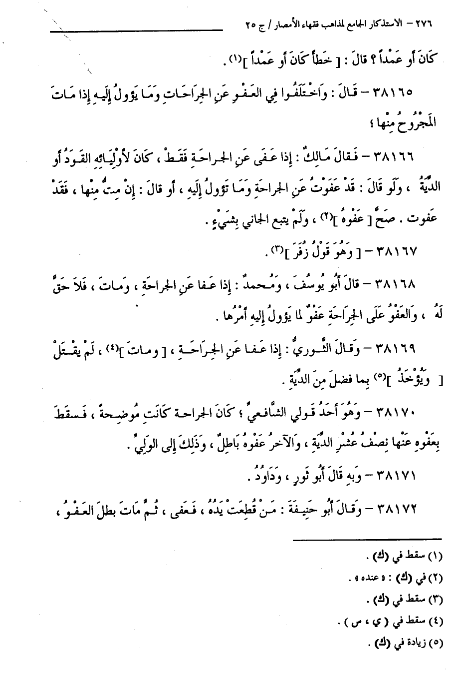 38165 - قَالَ: وَاخْتَلَفُوا فِي الْعَفْوِ عَنِ الْجِرَاحَاتِ، وَمَا يَئُولُ إِلَيْهِ إِذَا مَاتَ الْمَجْرُوحُ مِنْهَا.