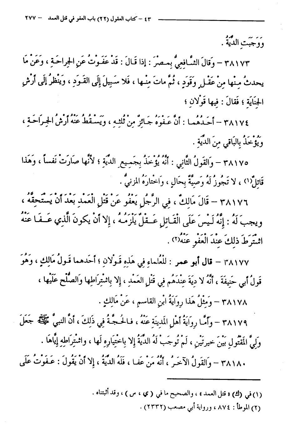 38177 - قَالَ أَبُو عُمَرَ: لِلْعُلَمَاءِ فِي هَذِهِ قَوْلَانِ، أَحَدُهُمَا قَوْلُ مَالِكٍ، وَهُوَ قَوْلُ أَبِي حَنِيفَةَ، أَنَّهُ لَا دِيَةَ عِنْدَهُمْ فِي قَتْلِ الْعَمْدِ، إِلَّا بِاشْتِرَاطِهَا وَالصُّلْحِ عَلَيْهَا.
