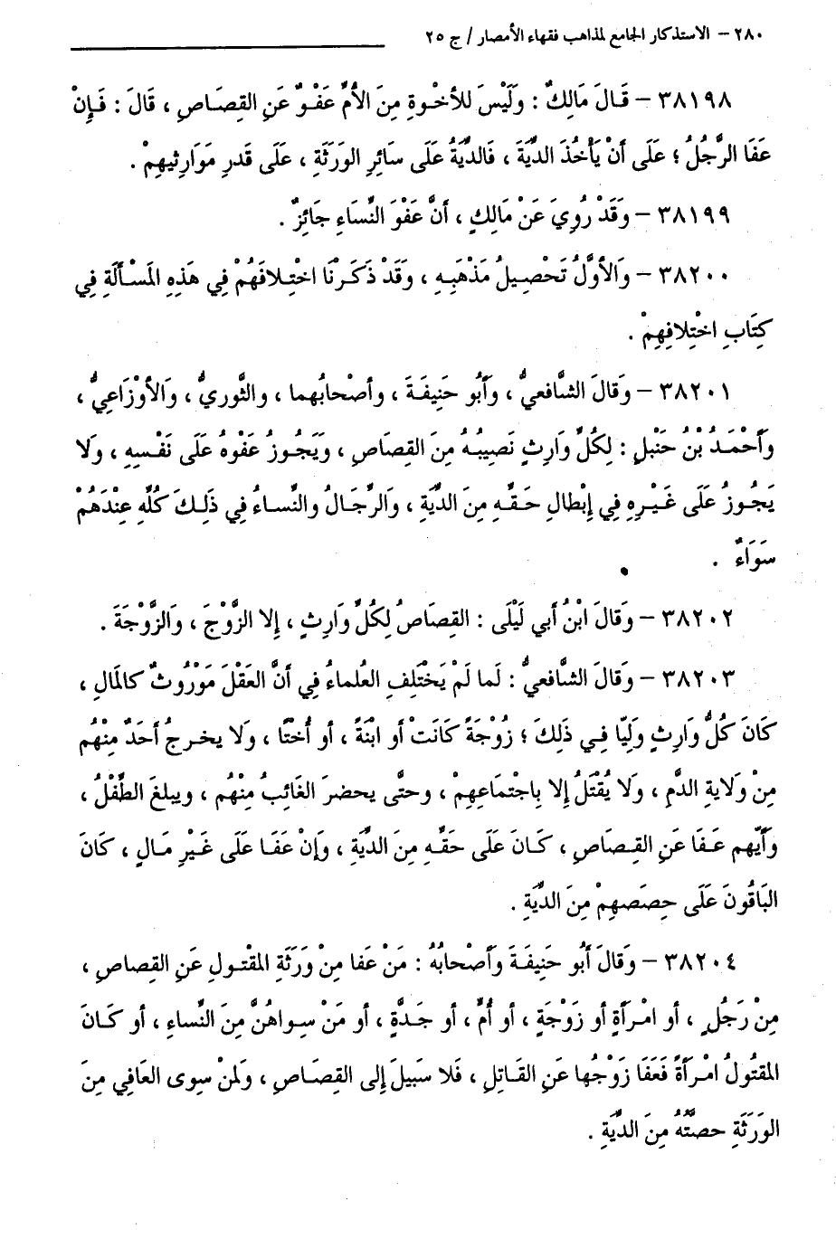 38201 - وَقَالَ الشَّافِعِيُّ، وَأَبُو حَنِيفَةَ، وَأَصْحَابُهُمَا، وَالثَّوْرِيُّ، وَالْأَوْزَاعِيُّ، وَأَحْمَدُ بْنُ حَنْبَلٍ: لِكُلِّ وَارِثٍ نَصِيبُهُ مِنَ الْقِصَاصِ، وَيَجُوزُ عَفْوُهُ عَلَى نَفْسِهِ، وَلَا يَجُوزُ عَلَى غَيْرِهِ فِي إِبْطَالِ حَقِّهِ مِنَ الدِّيَةِ، وَالرِّجَالُ وَالنِّسَاءُ فِي ذَلِكَ كُلِّهِ عِنْدَهُمْ سَوَاءٌ.