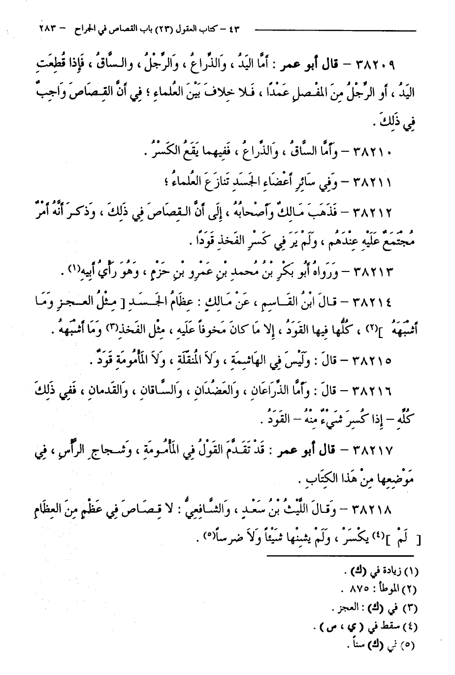 38216 - قَالَ: وَأَمَّا الذِّرَاعَانِ، وَالْعَضُدَانِ، وَالسَّاقَانِ، وَالْقَدَمَانِ، فَفِي ذَلِكَ كُلِّهِ - إِذَا كُسِرَ شَيْءٌ مِنْهُ - الْقَوَدُ.