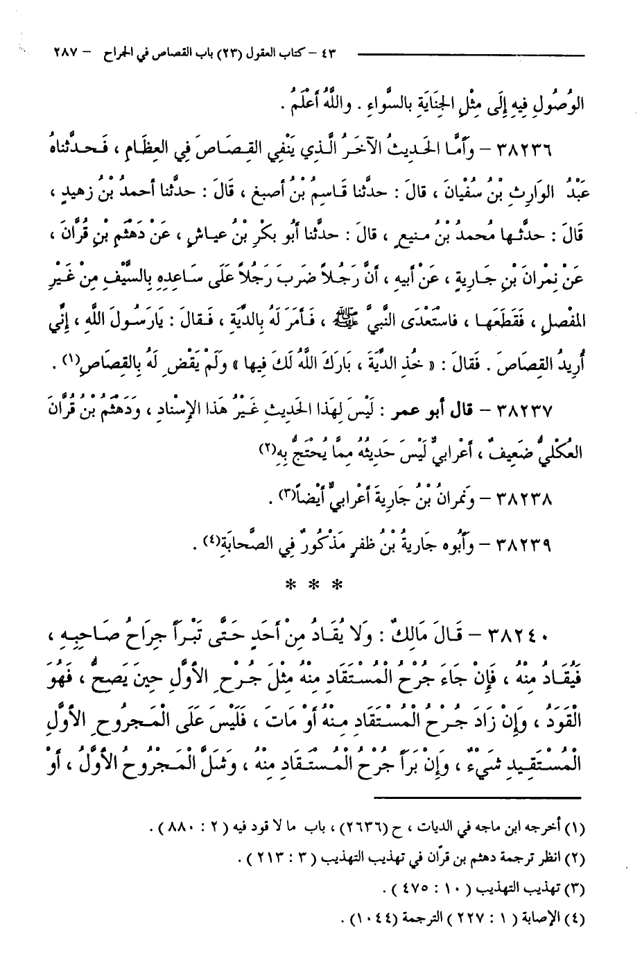 38236 - وَأَمَّا الْحَدِيثُ الْآخَرُ الَّذِي يَنْفِي الْقِصَاصَ فِي الْعِظَامِ، فَحَدَّثْنَاهُ عَبْدُ الْوَارِثِ بْنُ سُفْيَانَ، قَالَ: حَدَّثَنَا قَاسِمُ بْنُ أَصْبَغَ، قَالَ: حَدَّثَنَا أَحْمَدُ بْنُ زَهِيد ٍ، قَالَ: حَدَّثَنَا مُحَمَّدُ بْنُ مَنِيعٍ، قَالَ: حَدَّثَنَا أَبُو بَكْرِ بْنُ عَيَّاشٍ، عَنْ دَهْثَمِ بْنِ قُرَّانَ، عَنْ نَمِرَانِ بْنِ جَارِيَةَ، عَنْ أَبِيهِ،أَنَّ رَجُلًا ضَرَبَ رَجُلًا عَلَى سَاعِدِهِ بِالسَّيْفِ مِنْ غَيْرِ الْمَفْصِلِ، فَقَطَعَهَا، فَاسْتَعْدَى النَّبِيَّ - صَلَّى اللَّهُ عَلَيْهِ وَسَلَّمَ - فَأَمَرَ لَهُ بِالدِّيَةِ، فَقَالَ: يَا رَسُولَ اللَّهِ، إِنِّي أُرِيدُ الْقِصَاصَ. فَقَالَ " خُذِ الدِّيَةَ، بَارَكَ اللَّهُ لَكَ فِيهَا " وَلَمْ يَقْضِ لَهُ بِالْقِصَاصِ.