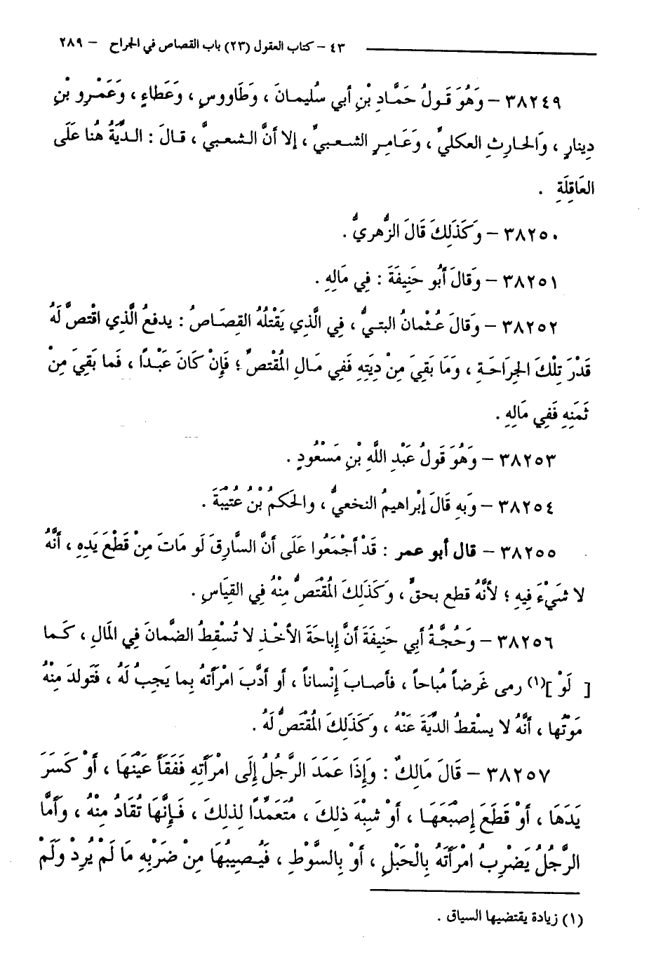 38249 - وَهُوَ قَوْلُ حَمَّادِ بْنِ أَبِي سُلَيْمَانَ، وَطَاوُسٍ، وَعَطَاءٍ، وَعَمْرِو بْنِ دِينَارٍ، وَالْحَارِثِ الْعُكْلِيِّ، وَعَامِرٍ الشَّعْبِيِّ، إِلَّا أَنَّ الشَّعْبِيَّ، قَالَ: الدِّيَةُ هُنَا عَلَى الْعَاقِلَةِ.