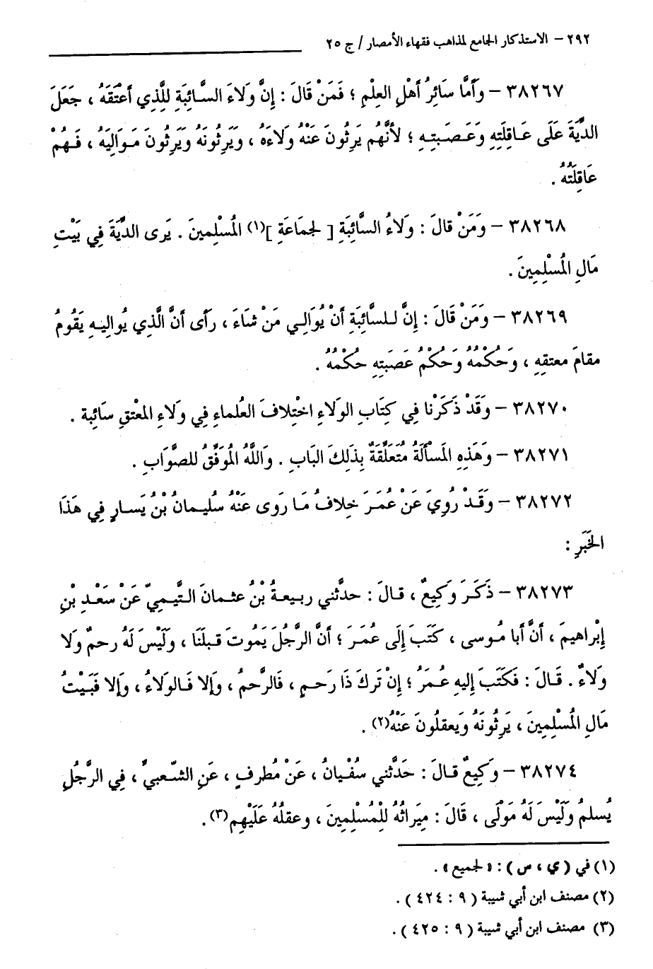 38268 - وَمَنْ قَالَ: وَلَاءُ السَّائِبَةِ لِجَمَاعَةِ الْمُسْلِمِينَ، يَرَى الدِّيَةَ فِي بَيْتِ مَالِ الْمُسْلِمِينَ.
