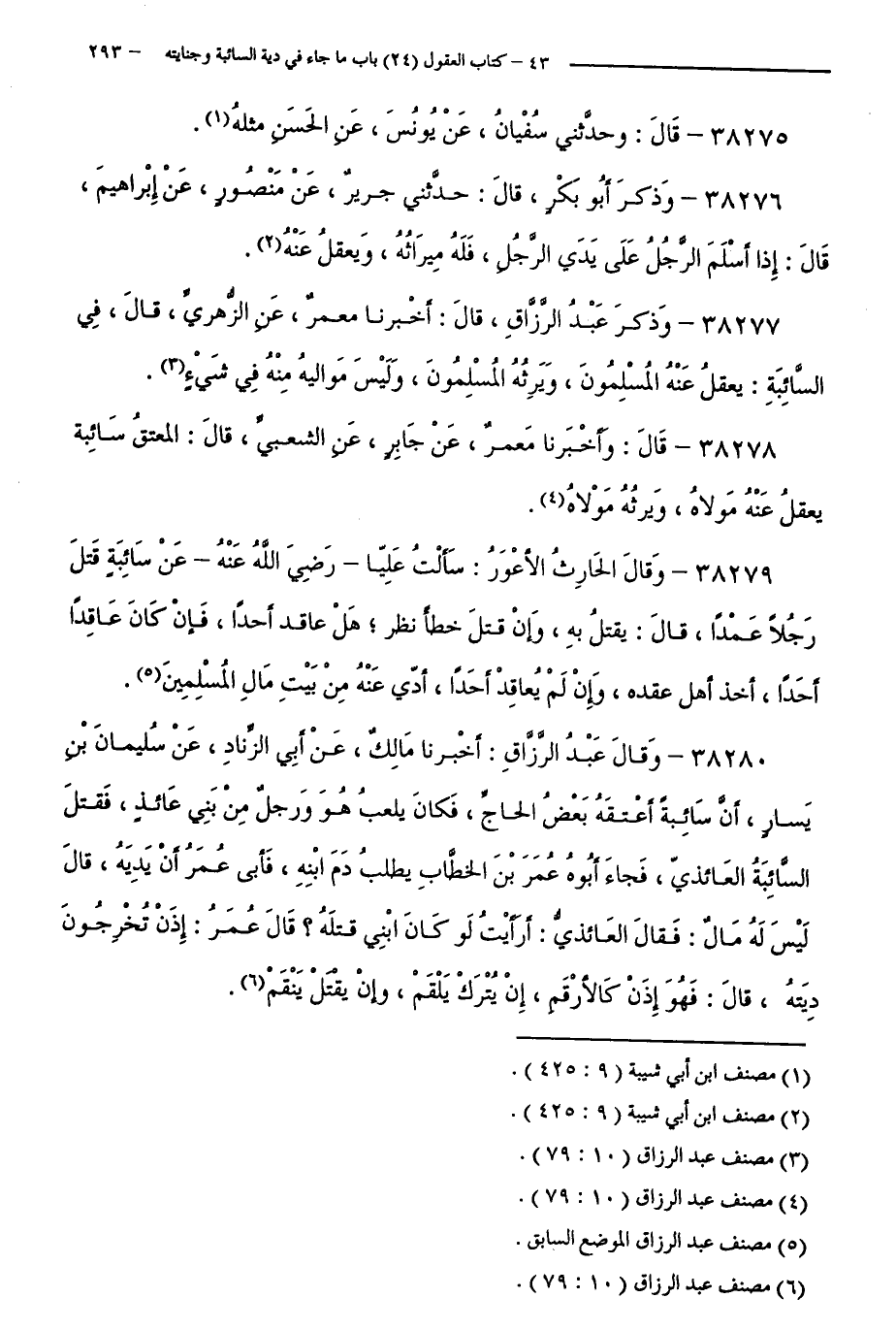 38277 - وَذَكَرَ عَبْدُ الرَّزَّاقِ، قَالَ: أَخْبَرَنَا مَعْمَرٌ، عَنِ الزُّهْرِيِّ، قَالَ، فِي السَّائِبَةِ يَعْقِلُ عَنْهُ الْمُسْلِمُونَ، وَيَرِثُهُ الْمُسْلِمُونَ، وَلَيْسَ مَوَالِيهِ مِنْهُ فِي شَيْءٍ.