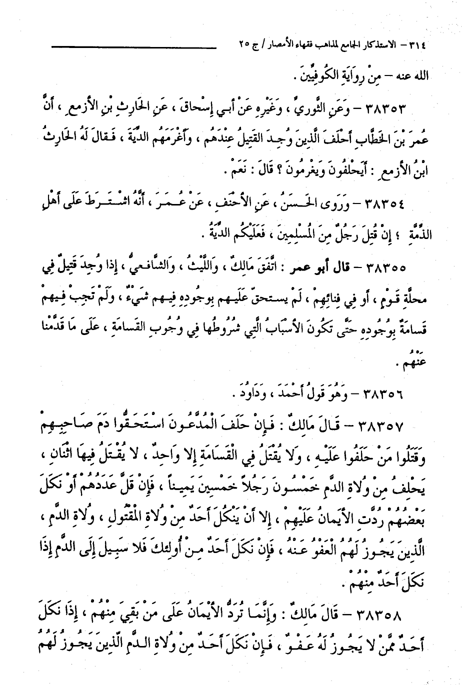 38353 - وَعَنِ الثَّوْرِيِّ، وَغَيْرِهِ عَنْ أَبِي إِسْحَاقَ، عَنِ الْحَارِثِ، الْأَزْمَعِ، أَنَّ عُمَرَ بْنَ الْخَطَّابِ أَحْلَفَ الَّذِينَ وُجِدَ الْقَتِيلُ عِنْدَهُمْ، وَأَغْرَمَهُمُ الدِّيَةَ، فَقَالَ لَهُ الْحَارِثُ بْنُ الْأَزْمَعِ: أَيَحْلِفُونَ وَيَغْرَمُونَ ؟ قَالَ: نَعَمْ.