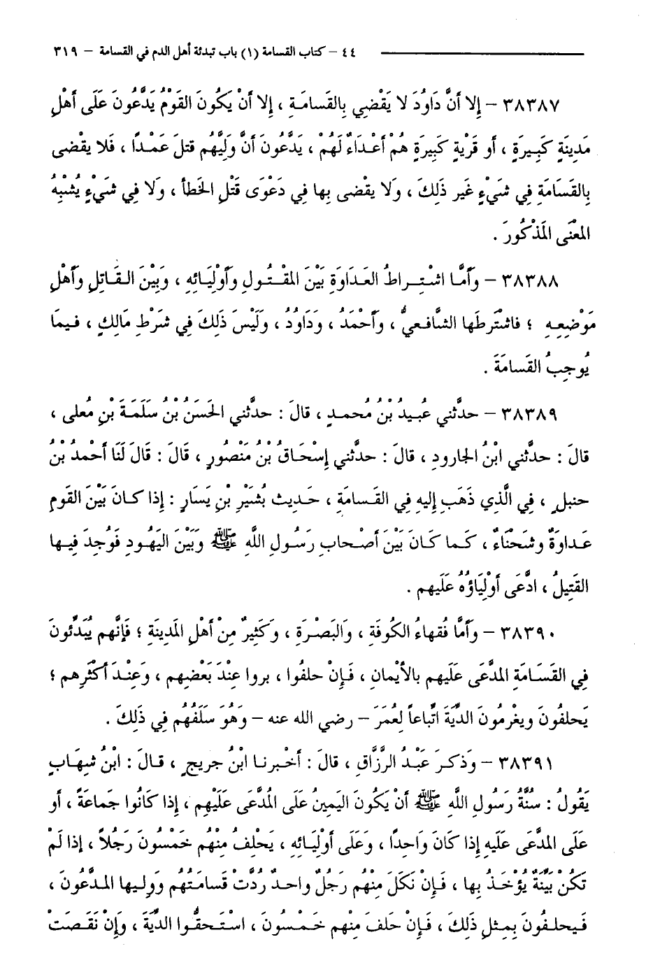 38389 - حَدَّثَنِي عُبَيْدُ بْنُ مُحَمَّدٍ، قَالَ: حَدَّثَنِي الْحَسَنُ بْنُ سَلَمَةَ بْنِ مُعَلَّى، قَالَ: حَدَّثَنِي ابْنُ الْجَارُودِ، قَالَ: حَدَّثَنِي إِسْحَاقُ بْنُ مَنْصُورٍ، قَالَ: قَالَ لَنَا أَحْمَدُ بْنُ حَنْبَلٍ، فِي الَّذِي ذَهَبَ إِلَيْهِ فِي الْقَسَامَةِ، حَدِيثُ بُشَيْرِ بْنِ يَسَارٍ: إِذَا كَانَ بَيْنَ الْقَوْمِ عَدَاوَةٌ وَشَحْنَاءُ، كَمَا كَانَ بَيْنَ أَصْحَابِ رَسُولِ اللَّهِ - صَلَّى اللَّهُ عَلَيْهِ وَسَلَّمَ - وَبَيْنَ الْيَهُودِ فَوُجِدَ فِيهَا الْقَتِيلُ، ادَّعَى أَوْلِيَاؤُهُ عَلَيْهِمْ.