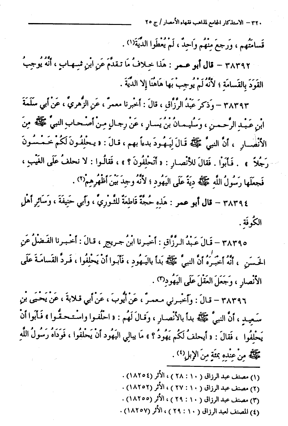 38395 - قَالَ عَبْدُ الرَّزَّاقِ: أَخْبَرَنَا ابْنُ جُرَيْجٍ، قَالَ: أَخْبَرَنَا الْفَضْلُ عَنِ الْحَسَنِ، أَنَّهُ أَخْبَرَهُأَنَّ النَّبِيَّ - صَلَّى اللَّهُ عَلَيْهِ وَسَلَّمَ - بَدَأَ بِالْيَهُودِ، فَأَبَوْا أَنْ يَحْلِفُوا، فَرَدَّ الْقَسَامَةَ عَلَى الْأَنْصَارِ، وَجَعَلَ الْعَقْلَ عَلَى الْيَهُودِ.