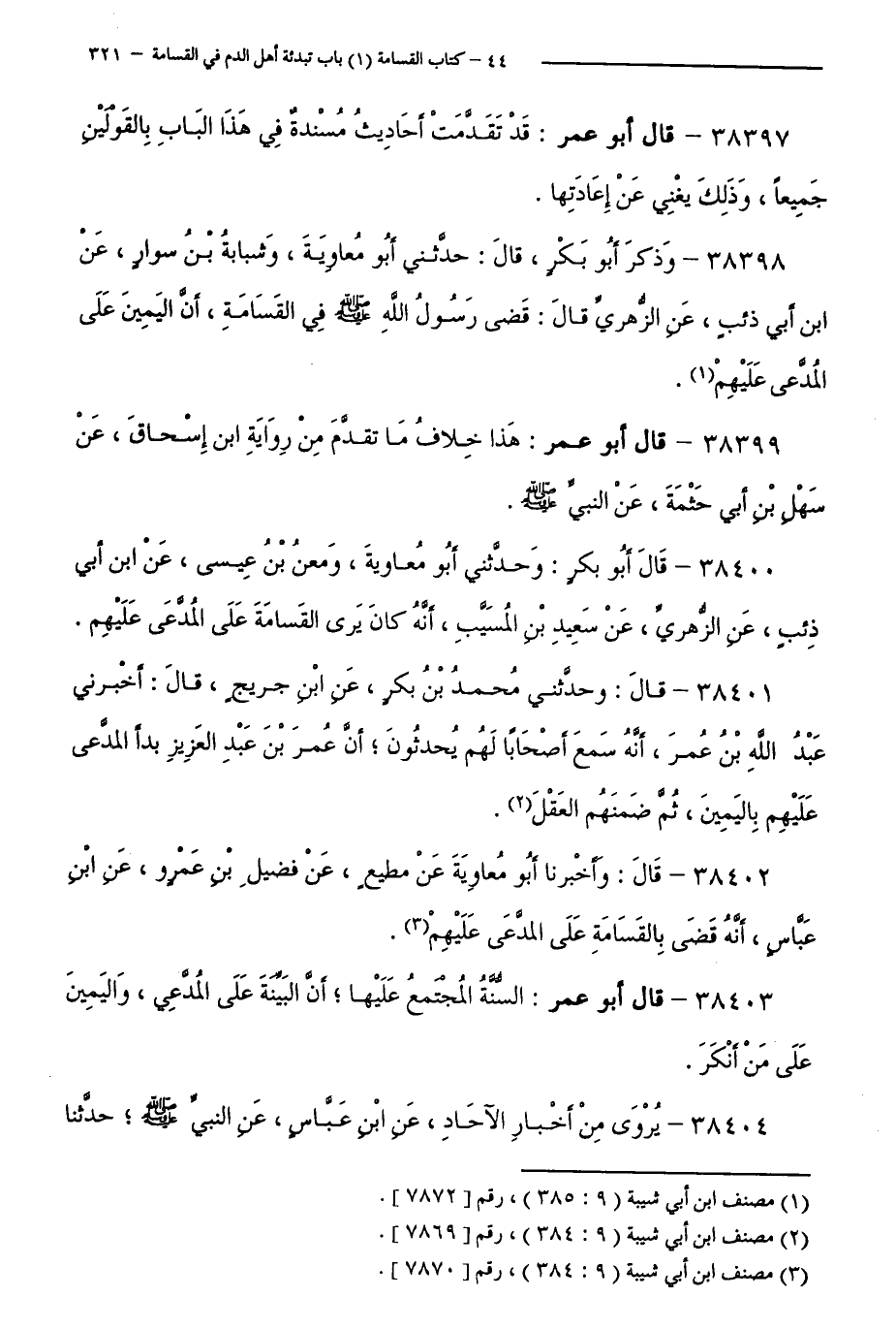 38402 - قَالَ أَبُو عُمَرَ: وَأَخْبَرَنَا أَبُو مُعَاوِيَةَ عَنْ مُطِيعٍ، عَنْ فُضَيْلِ بْنِ عَمْرٍو، عَنِ ابْنِ عَبَّاسٍ، أَنَّهُ قَضَى بِالْقَسَامَةِ عَلَى الْمُدَّعَى عَلَيْهِمْ.