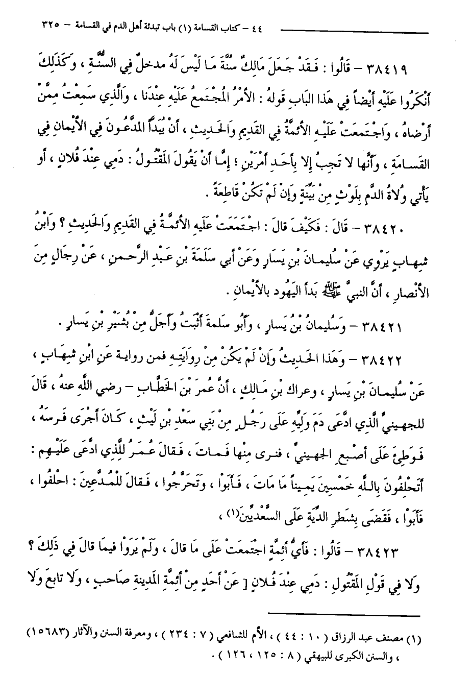 38420 - قَالَ: فَكَيْفَ قَالَ: اجْتَمَعَتْ عَلَيْهِ الْأَئِمَّةُ فِي الْقَدِيمِ وَالْحَدِيثِ، وَابْنُ شِهَابٍ يَرْوِي عَنْ سُلَيْمَانَ بْنِ يَسَارٍ وَعَنْ أَبِي سَلَمَةَ بْنِ عَبْدِ الرَّحْمَنِ، عَنْ رِجَالٍ مِنَ الْأَنْصَارِ، أَنَّ النَّبِيَّ - صَلَّى اللَّهُ عَلَيْهِ وَسَلَّمَ - بَدَّأَ الْيَهُودَ بِالْأَيْمَانِ ؟