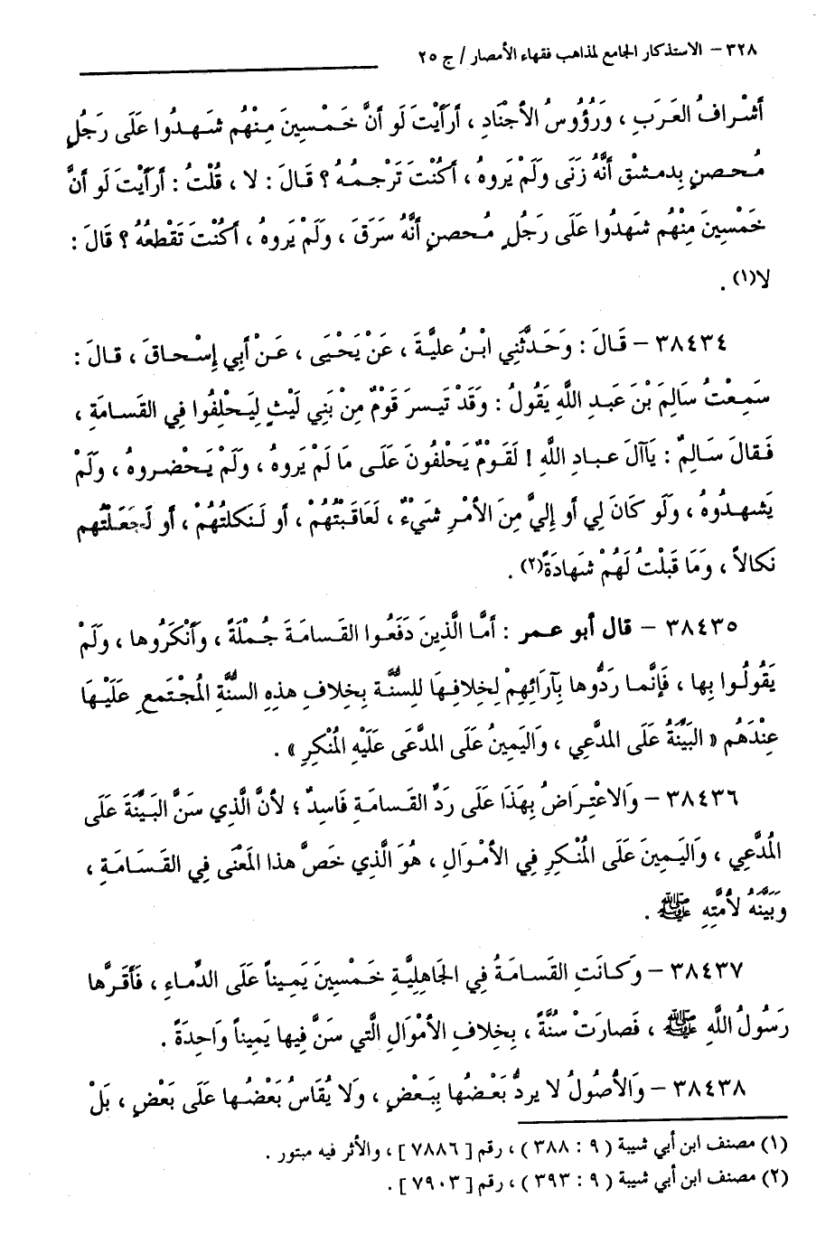 38434 - قَالَ: وَحَدَّثَنِي ابْنُ عُلَيَّةَ، عَنْ يَحْيَى، عَنْ أَبِي إِسْحَاقَ، قَالَ: سَمِعْتُ سَالِمَ بْنَ عَبْدِ اللَّهِ يَقُولُ: وَقَدْ تَيَسَّرَ قَوْمٌ مِنْ بَنِي لَيْثٍ لِيَحْلِفُوا فِي الْقَسَامَةِ، فَقَالَ سَالِمٌ: يَا آلَ عِبَادِ اللَّهِ ! لَقَوْمٌ يَحْلِفُونَ عَلَى مَا لَمْ يَرَوْهُ، وَلَمْ يَحْضُرُوهُ، وَلَمْ يَشْهَدُوهُ، وَلَوْ كَانَ لِي أَوْ إِلَيَّ مِنَ الْأَمْرِ شَيْءٌ، لَعَاقَبْتُهُمْ، أَوْ لَنَكَلْتُهُمْ، أَوْ لَجَعَلْتُهُمْ نَكَالًا، وَمَا قَبِلْتُ لَهُمْ شَهَادَةً.