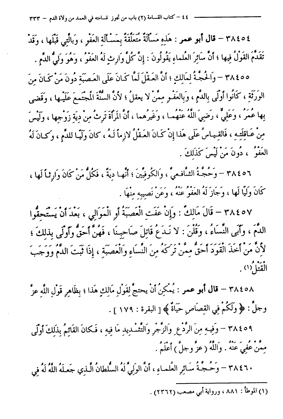 38454 - قَالَ أَبُو عُمَرَ: هَذِهِ مَسْأَلَةٌ مُتَعَلِّقَةٌ بِمَسْأَلَةِ الْعَفْوِ، وَبِالَّتِي قَبْلَهَا، وَقَدْ تَقَدَّمَ الْقَوْلُ فِيهَا، أَنَّ سَائِرَ الْعُلَمَاءِ يَقُولُونَ: إِنَّ كُلَّ وَارِثٍ لَهُ الْعَفْوُ، وَهُوَ وَلِيُّ الدَّمِ.