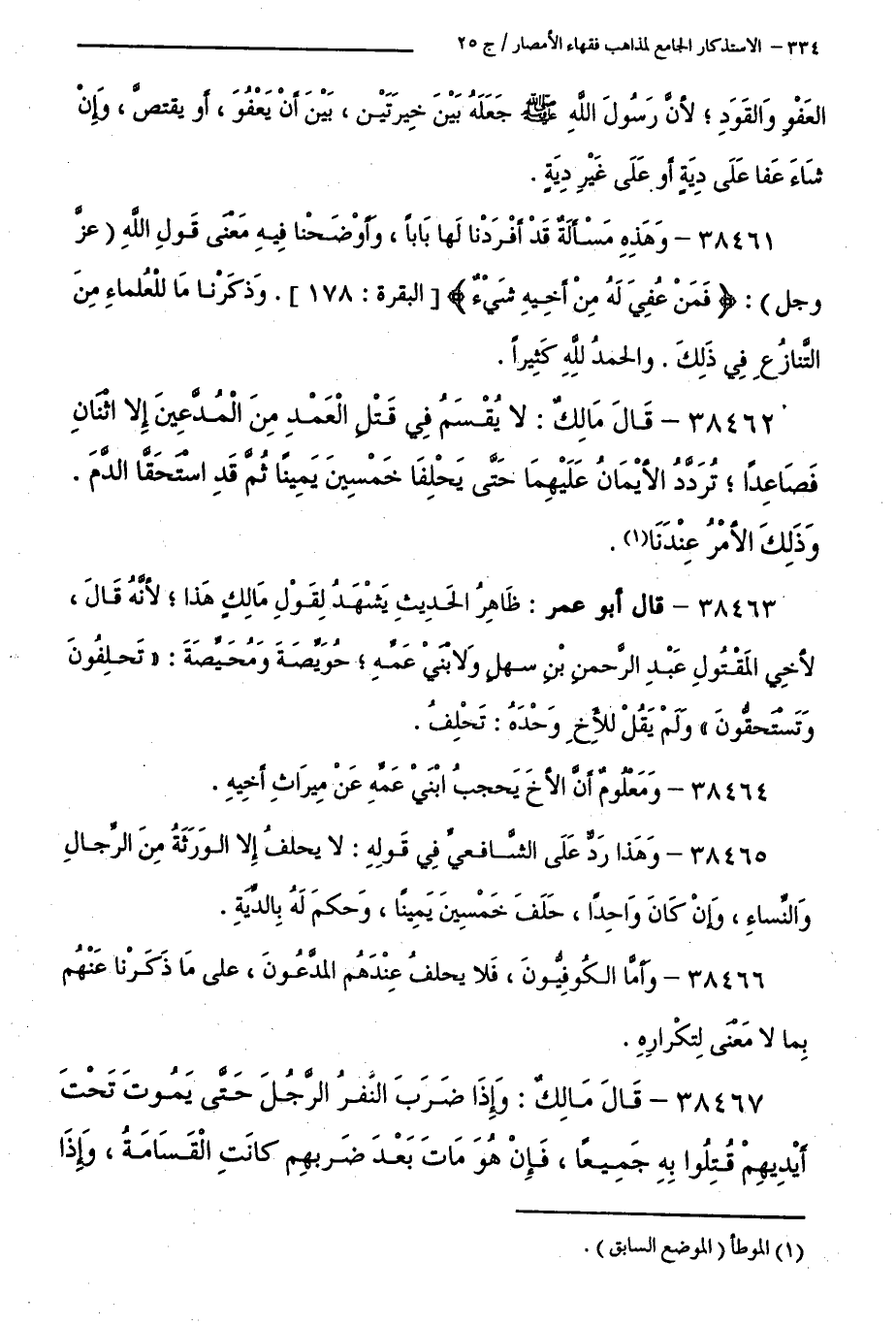 38463 - قَالَ أَبُو عُمَرَ: ظَاهِرُ الْحَدِيثِ يَشْهَدُ لِقَوْلِ مَالِكٍ هَذَا، لِأَنَّهُ قَالَ لِأَخِي الْمَقْتُولِ عَبْدِ الرَّحْمَنِ بْنِ سَهْلٍ وَلِابْنَيْ عَمِّهِ، حُوَيِّصَةَ وَمُحَيِّصَةَ: " تَحْلِفُونَ وَتَسْتَحِقُّونَ " وَلَمْ يَقُلْ لِلْأَخِ وَحْدَهُ: تَحْلِفُ.
