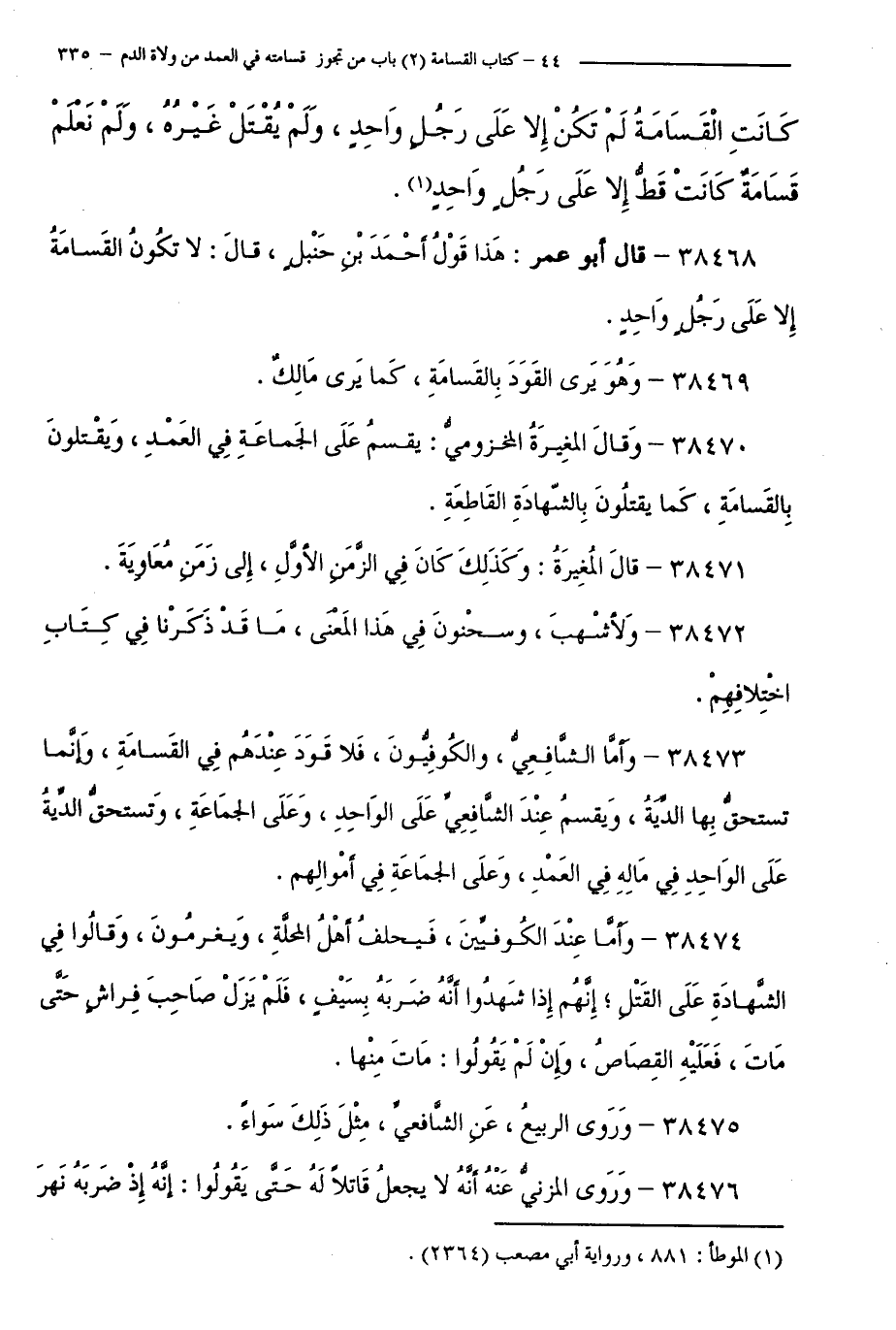 38468 - قَالَ أَبُو عُمَرَ: هَذَا قَوْلُ أَحْمَدَ بْنِ حَنْبَلٍ، قَالَ: لَا تَكُونُ الْقَسَامَةُ إِلَّا عَلَى رَجُلٍ وَاحِدٍ.