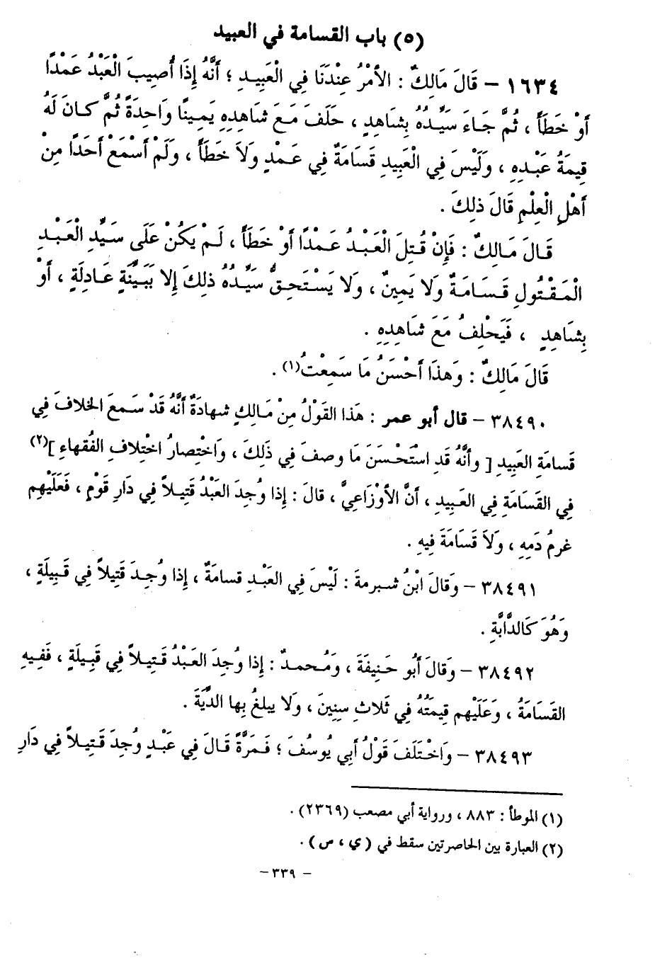 38490 - قَالَ أَبُو عُمَرَ: هَذَا الْقَوْلُ مِنْ مَالِكٍ شَهَادَةٌ أَنَّهُ قَدْ سَمِعَ الْخِلَافَ فِي قَسَامَةِ الْعَبِيدِ وَأَنَّهُ قَدِ اسْتَحْسَنَ مَا وَصَفَ فِي ذَلِكَ، وَاخْتِصَارُ اخْتِلَافِ الْفُقَهَاءِ فِي الْقَسَامَةِ فِي الْعَبِيدِ، أَنَّ الْأَوْزَاعِيَّ، قَالَ: إِذَا وُجِدَ الْعَبْدُ قَتِيلًا فِي دَارِ قَوْمٍ، فَعَلَيْهِمْ غُرْمُ دَمِهِ، وَلَا قَسَامَةَ فِيهِ.