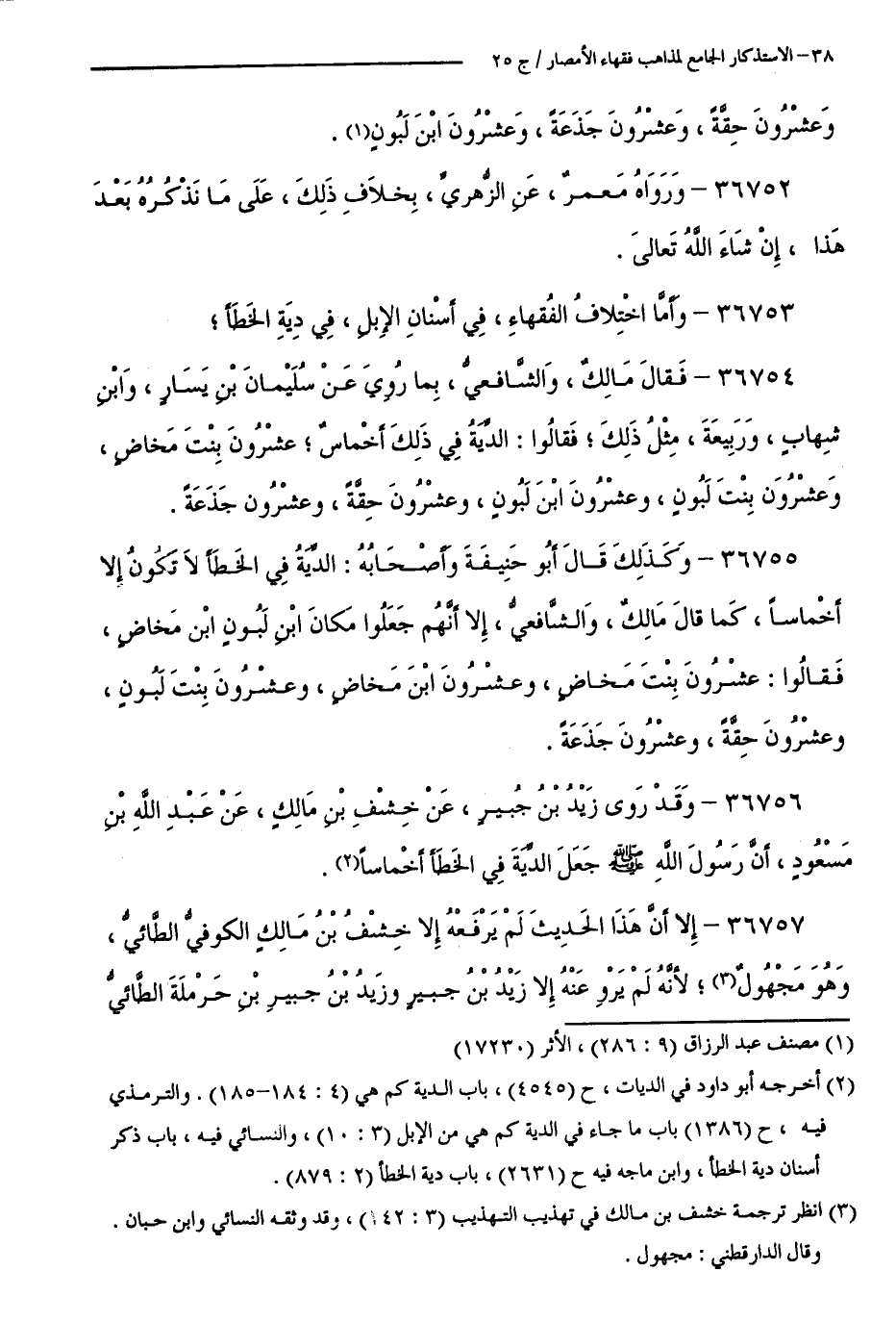 36756 - وَقَدْ رَوَى زَيْدُ بْنُ جُبَيْرٍ، عَنْ خِشْفِ بْنِ مَالِكٍ، عَنْ عَبْدِ اللَّهِ بْنِ مَسْعُودٍ،أَنَّ رَسُولَ اللَّهِ - صَلَّى اللَّهُ عَلَيْهِ وَسَلَّمَ - جَعَلَ الدِّيَةَ فِي الْخَطَأِ أَخْمَاسًا.