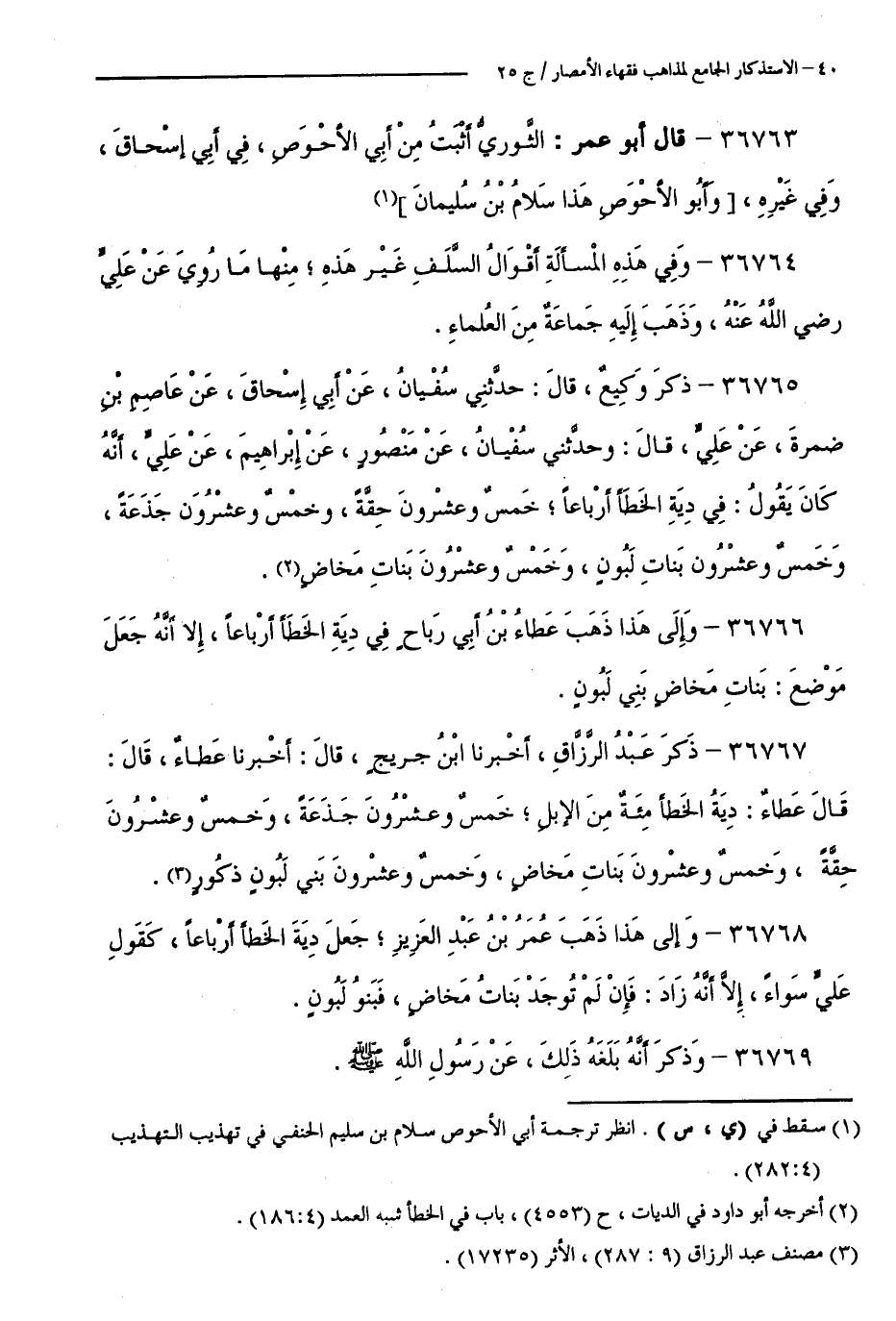 36766 - وَإِلَى هَذَا ذَهَبَ عَطَاءُ بْنُ أَبِي رَبَاحٍ فِي دِيَةِ الْخَطَأِ أَرْبَاعًا، إِلَّا أَنَّهُ جَعَلَ مَوْضِعَ بَنَاتِ مَخَاضٍ بَنِي لَبُونٍ.