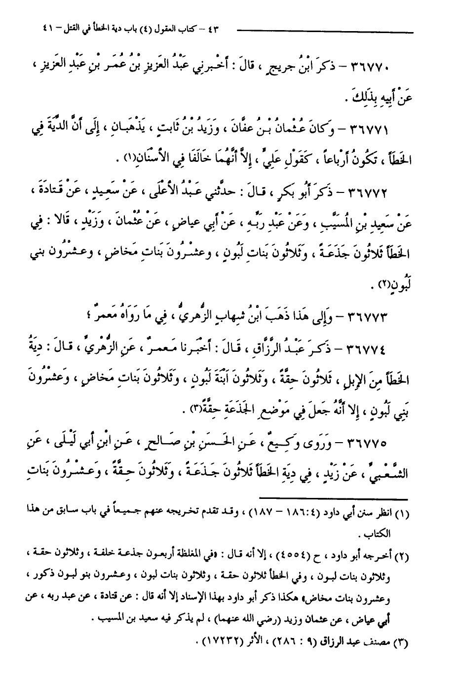 36774 - ذَكَرَ عَبْدُ الرَّزَّاقِ، قَالَ: أَخْبَرَنَا مَعْمَرٌ عَنِ الزُّهْرِيِّ، قَالَ: دِيَةُ الْخَطَأِ مِنَ الْإِبِلِ، ثَلَاثُونَ حِقَّةً، وَثَلَاثُونَ ابْنَةَ لَبُونٍ، وَثَلَاثُونَ بَنَاتِ مَخَاضٍ، وَعِشْرُونَ بَنِي لَبُونٍ، إِلَّا أَنَّهُ جَعَلَ فِي مَوْضِعِ الْجَذَعَةِ حِقَّةً.