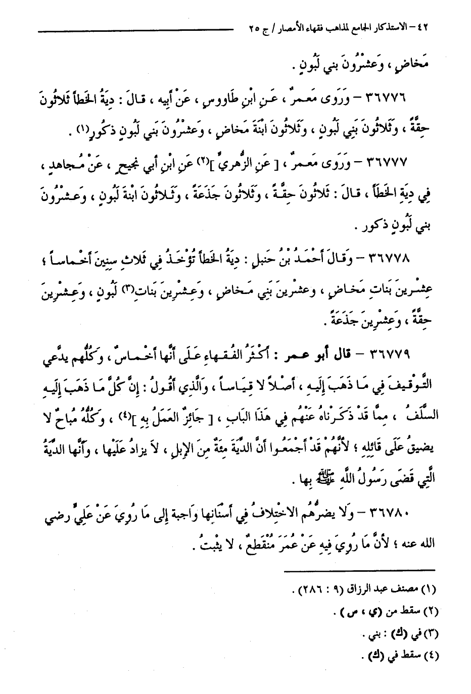 36776 - وَرَوَى مَعْمَرٌ، عَنِ ابْنِ طَاوُسٍ، عَنْ أَبِيهِ، قَالَ: دِيَةُ الْخَطَأِ ثَلَاثُونَ حِقَّةً، وَثَلَاثُونَ بَنِي لَبُونٍ، وَثَلَاثُونَ ابْنَةَ مَخَاضٍ، وَعِشْرُونَ بَنِي لَبُونٍ ذُكُورٍ.